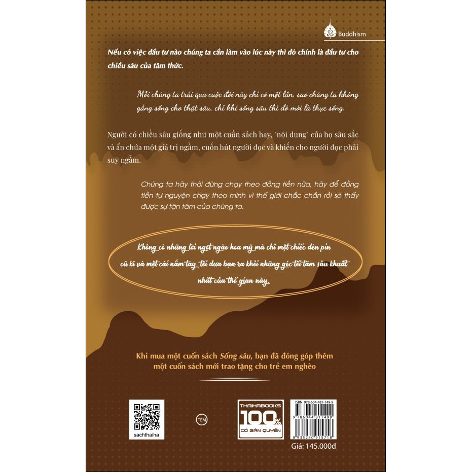 Tuy “Sống Sâu” – Deep Living là một khái niệm sống còn khá mới nhưng ý nghĩa của nó thật rất rộng sâu và phản ánh cách chúng ta vận hành cuộc sống của mình trên nhiều khía cạnh khác nhau. Thông qua cuốn sách này, tác giả mượn Đạo để nói việc Đời, và cũng xin được đưa vào một số trích đoạn Kinh điển Phật giáo để làm phương tiện dẫn chứng với mong muốn giúp các bạn trẻ có được góc nhìn sâu hơn về mọi mặt của cuộc sống, để thấu, để ngộ, để có thể thành tựu một cuộc đời an nhiên, hạnh phúc, và sau cùng, có thể chứng đắc được Đạo quả ngay trong đời thường.