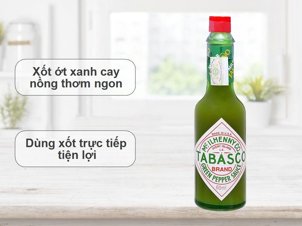- HSD: 3 năm kể từ ngày sản xuất• Sốt ớt xanh Tabasco 60ml-Tabasco Garlic Green Pepper Sauce 60ml : VỊ CAY NHẸ