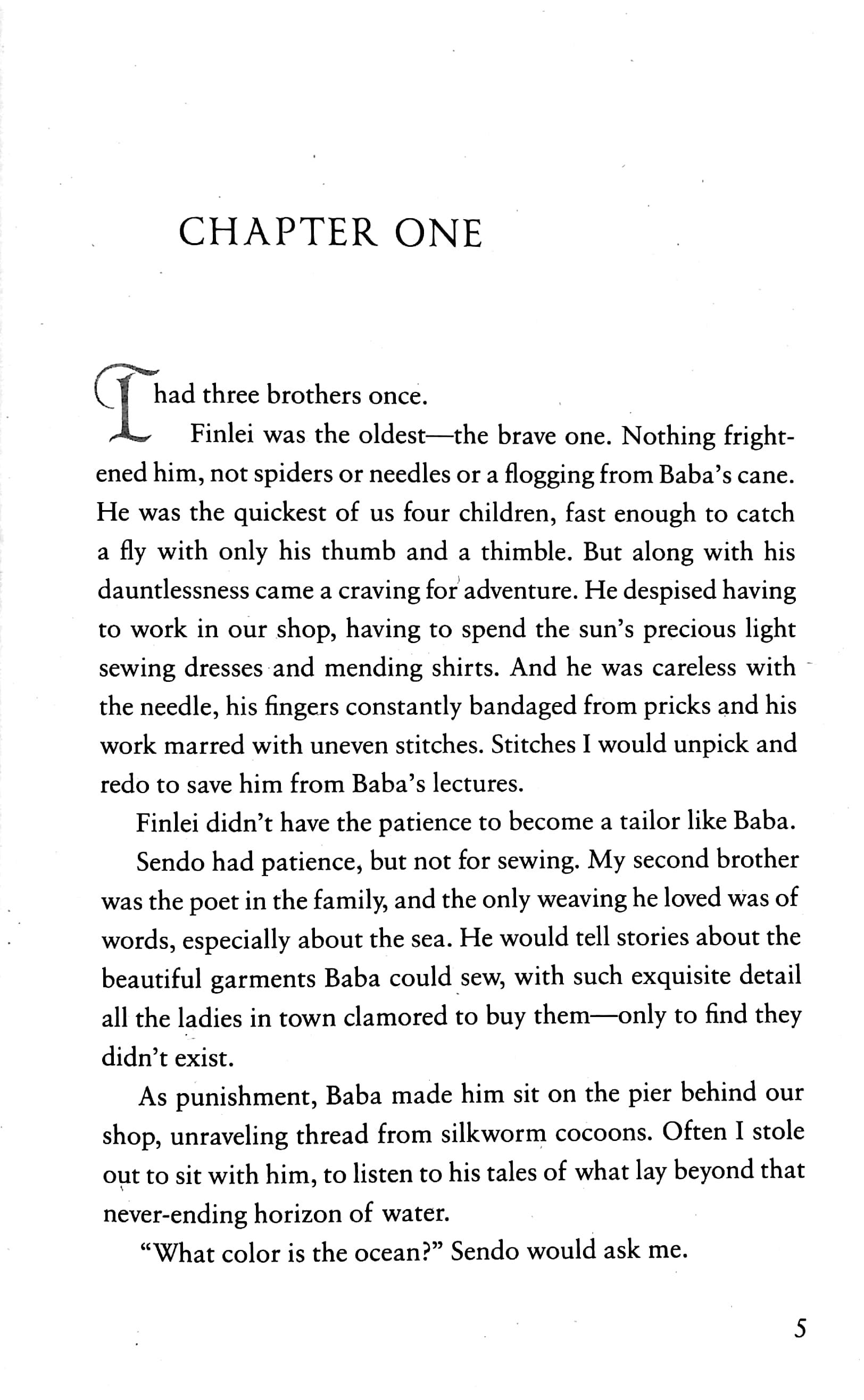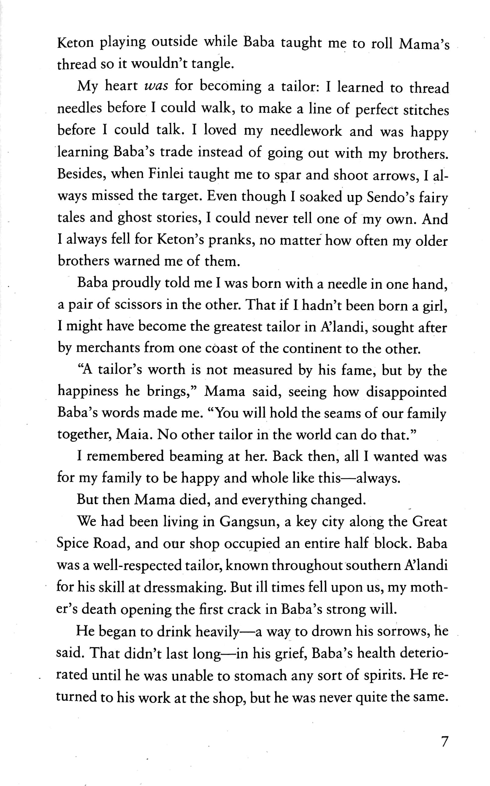 Maia Tamarin dreams of becoming the greatest tailor in the land, but as a girl, the best she can hope for is to marry well. When a royal messenger summons her ailing father, once a tailor of renown, to court, Maia makes the ultimate sacrifice and poses as a boy to take his place. She knows her life is forfeit if her secret is discovered, but she'll take that risk to achieve her dream and save her family from ruin. There's just one catch: Maia is one of twelve tailors in a cutthroat competition for the job.