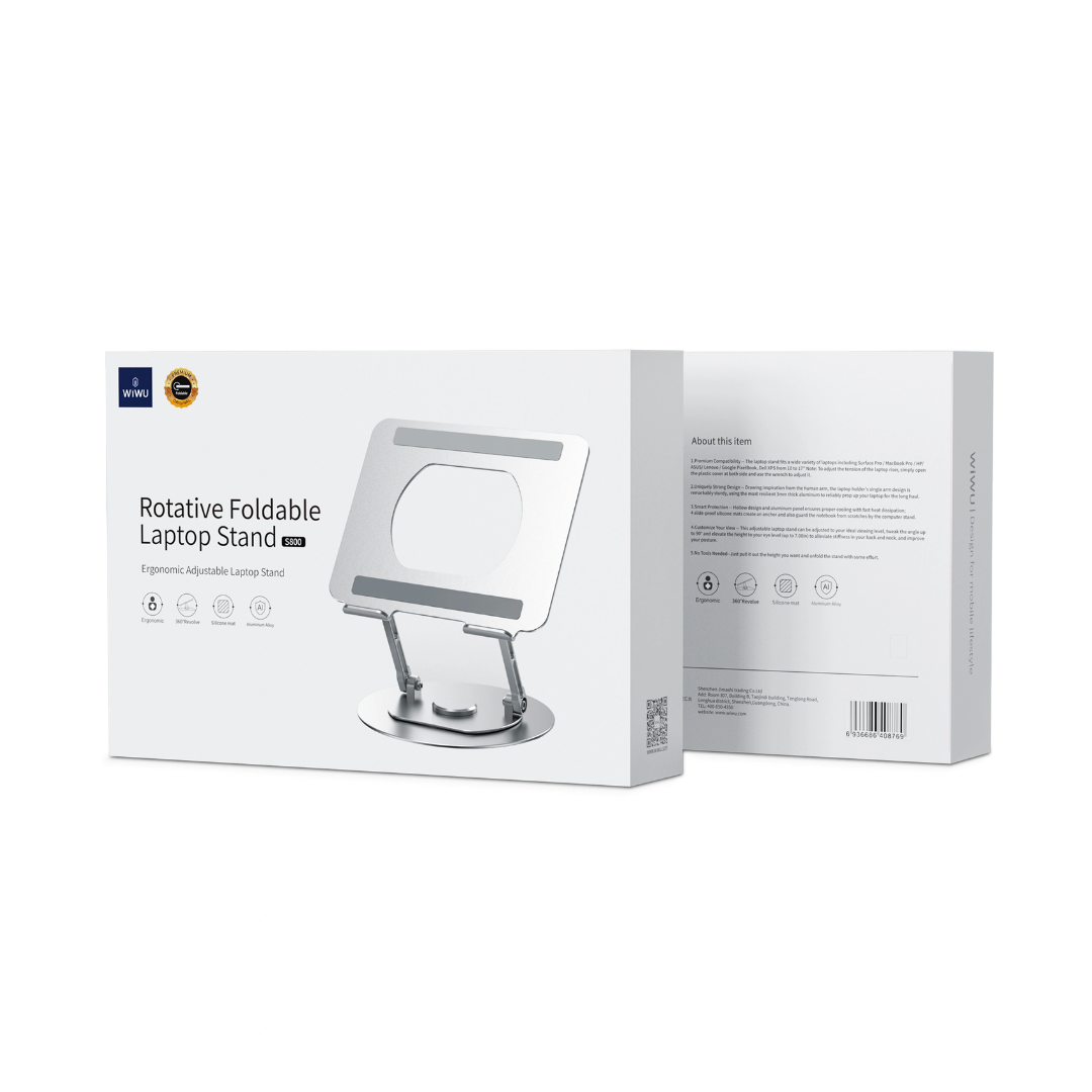 Nhu cầu sử dụng một chiếc Stand/giá đỡ trên bàn làm việc ngày càng đòi hỏi nhiều sự tiện lợi hơn. Cho nên, một chiếc giá đỡ cố định dần không còn phù hợp đối với xu hướng setup hiện đại yêu cầu sự tuỳ biến và gọn gàng. Vì thế, WiWU đã cho ra mắt chiếc Stand/ Đế Nhôm laptop Xoay WIWU S800 Pro được nâng cấp mượt mà và hỗ trợ tốt hơn cho người dùng.   Khung nhôm chắc chắn, không gỉ   Đế Nhôm laptop Xoay WIWU S800 Pro được cấu tạo từ hợp kim nhôm cao cấp, vẻ ngoài sáng bóng mà không bị gỉ màu theo thời gian. Chất liệu nhôm chắc chắn đảm bảo sự an toàn cho laptop/Laptop/Tablet của bạn trong quá trình sử dụng. Thiết kế độc đáo sử dụng chất liệu nhôm dày 3mm đàn hồi nhất để nâng đỡ tính của bạn cực kỳ chắc chắn.   Khớp xoay 360° linh hoạt, điều chỉnh độ cao, độ nghiêng   Với thiết kế công thái học, Stand laptop Xoay WIWU S800 Pro có dạng hình chữ Z với 2 khớp nối cực kì chắc chắn. Khớp xoay 360 độ tiện dụng, rất dễ dàng thay đổi góc nhìn mà không cần di chuyển cồng kềnh. Ngoài ra, bạn có thể nhanh chóng điều chỉnh độ cao, độ nghiêng của giá đỡ với thiết kế bản lề kép, tạo tư thế phù hợp nhất với nhiều nhu cầu làm việc, giải trí. Stand/ Đế Nhôm laptop Xoay WIWU S800 Pro cũng có thể xếp gọn lại, không chiếm quá nhiều không gian trên bàn làm việc.   Khả năng tản nhiệt tốt   Stand laptop Xoay WIWU S800 Pro được đánh giá cao vì có một phần nhờ vào thiết kế rỗng và bảng điều khiển bằng nhôm hỗ trợ tản nhiệt. Các khoảng trống tưởng chừng đơn giản nhưng thực sự hữu ích khi bạn sử dụng máy liên tục ở cường độ cao. Việc sử dụng những thiết bị tản nhiệt cũng giúp kéo dài tuổi thọ cho máy hơn.   Đệm cao su êm ái   WiWU đã rất tinh tế khi chú ý đến từng chi tiết nhỏ của sản phẩm. Điển hình là việc thêm những miếng đệm cao su vào bề mặt tiếp xúc giữa giá đỡ và laptop. Những miếng đệm cao su sẽ giúp tăng ma sát, giữ máy chắc chắn hơn. Không bị trơn trượt khi sử dụng và hạn chế việc trầy xước không mong muốn. Ngoài ra, bên dưới giá đỡ cũng được bọc cao su ở 4 góc, giá đỡ sẽ luôn đứng vững, trở thành điểm tựa cứng cáp.   Điều chỉnh độ cao và dễ dàng gấp gọn    Stand Xoay WIWU S800 Pro được thiết kế hiện đại với 2 khớp. Bản lề giúp việc điều chỉnh độ cao, góc nghiêng cho phù hợp với tầm nhìn 1 cách dễ dàng. Dễ dàng sử dụng kéo ra theo chiều cao mong muốn. Giá đỡ tính phù hợp với nhiều loại máy tính xách tay hiện nay từ 10 đến 17 inch. Ngoài ra có thể để được các loại máy tính bảng thông dụng hiện nay.