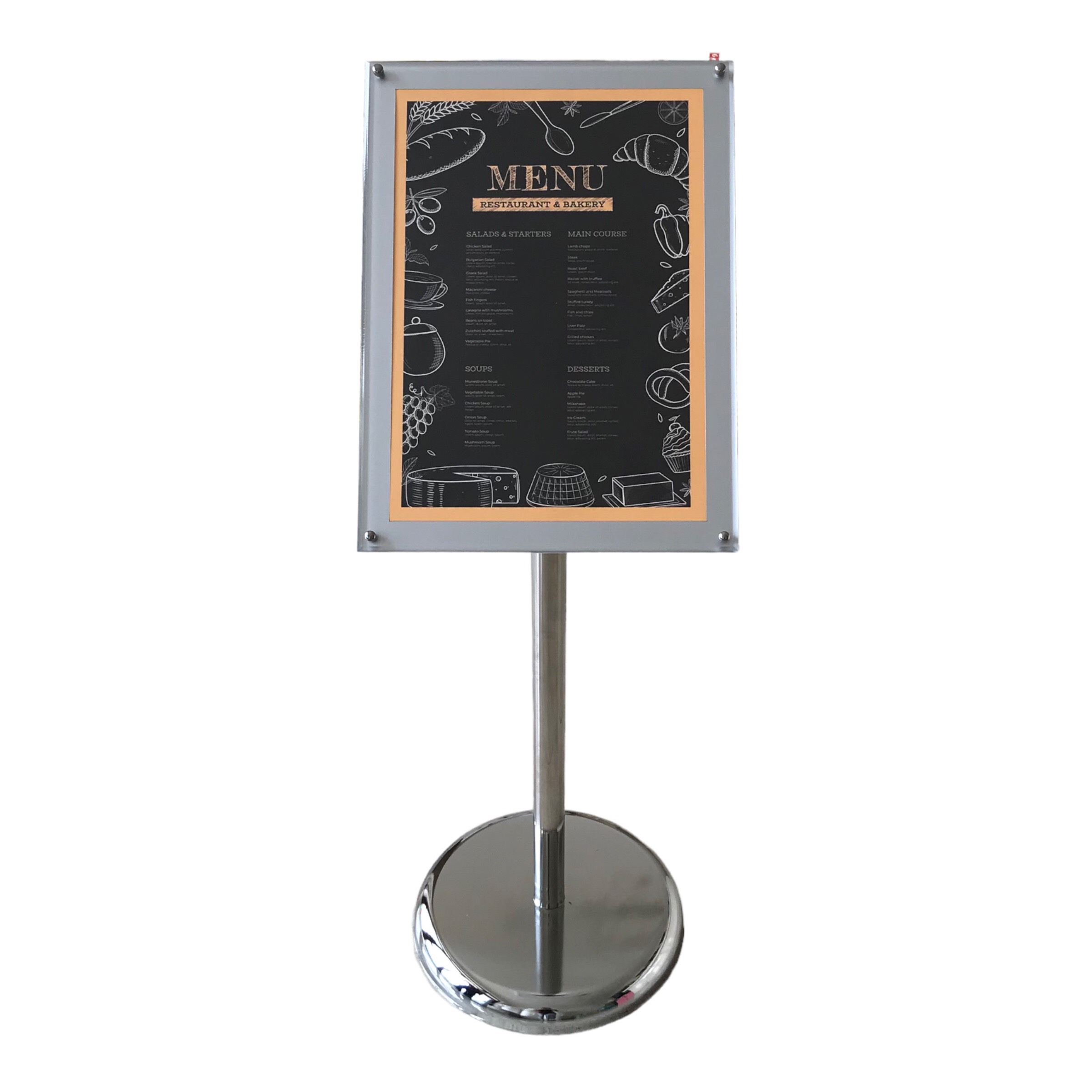 Trụ inox khung mica bền đẹp có thể tháo rời các bộ phận để di chuyển. Mặt bảng có kích thước A4 có thể xoay 360 độ. Độ cao của standee trụ inox khung nhôm A4 có thể điều chỉnh được điều chỉnh được từ 72cm đến 125 cm. Bốn cạnh xung quanh standee có thể lật lên, lật xuống dễ dàng khi cần thay đổi menu.