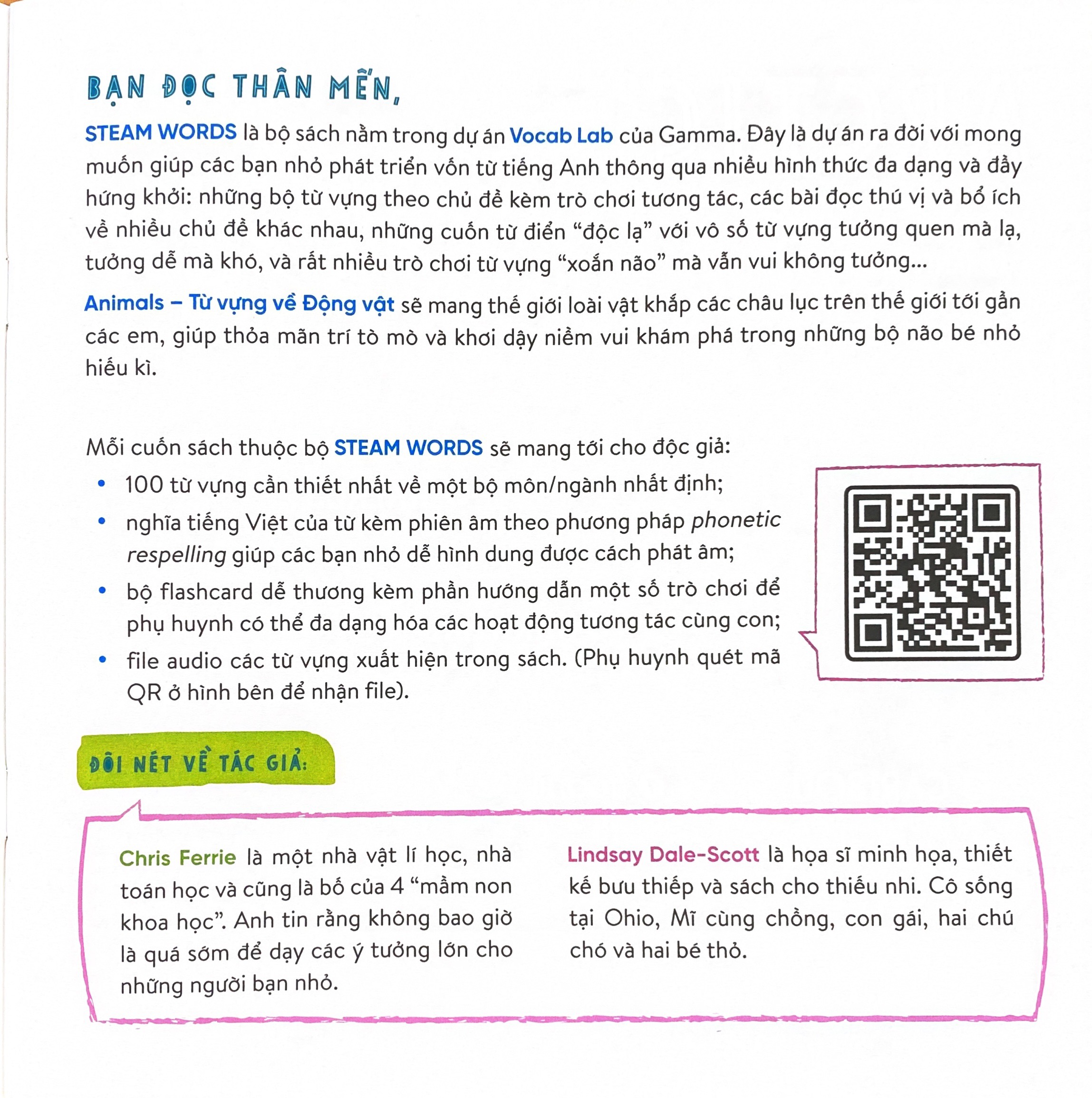 STEAM WORDS là bộ sách cung cấp những từ vựng tiếng Anh cần thiết về các lĩnh vực trên. Bộ sách gồm 10 cuốn, sẽ lần lượt được ra mắt trong năm 2022 này. 5 cuốn sách đầu tiên bao gồm: