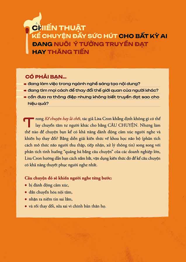 Trong Story Or Die - Kể Chuyện Hay Là Chết, tác giả Lisa Cron khẳng định không gì có thể lay chuyển tâm tư người khác cho bằng CÂU CHUYỆN. Nhưng làm thế nào để chuyện bạn kể có khả năng đánh động cảm xúc người nghe và khiến họ thay đổi? Bằng diễn giải kiến thức về khoa học não bộ song song với phân tích tình huống “quảng bá bằng câu chuyện” của các doanh nghiệp lớn, Lisa Cron hướng dẫn bạn cách nắm bắt, vận dụng kiến thức đó để kể câu chuyện có khả năng thuyết phục người nghe nhất. Câu chuyện đó sẽ khiến người nghe từng bước: • bị đánh động cảm xúc, • dần chuyển hóa nội tâm, • nhận ra niềm tin sai lầm, • và rồi thay đổi, sửa sai vì chính bản thân họ.
