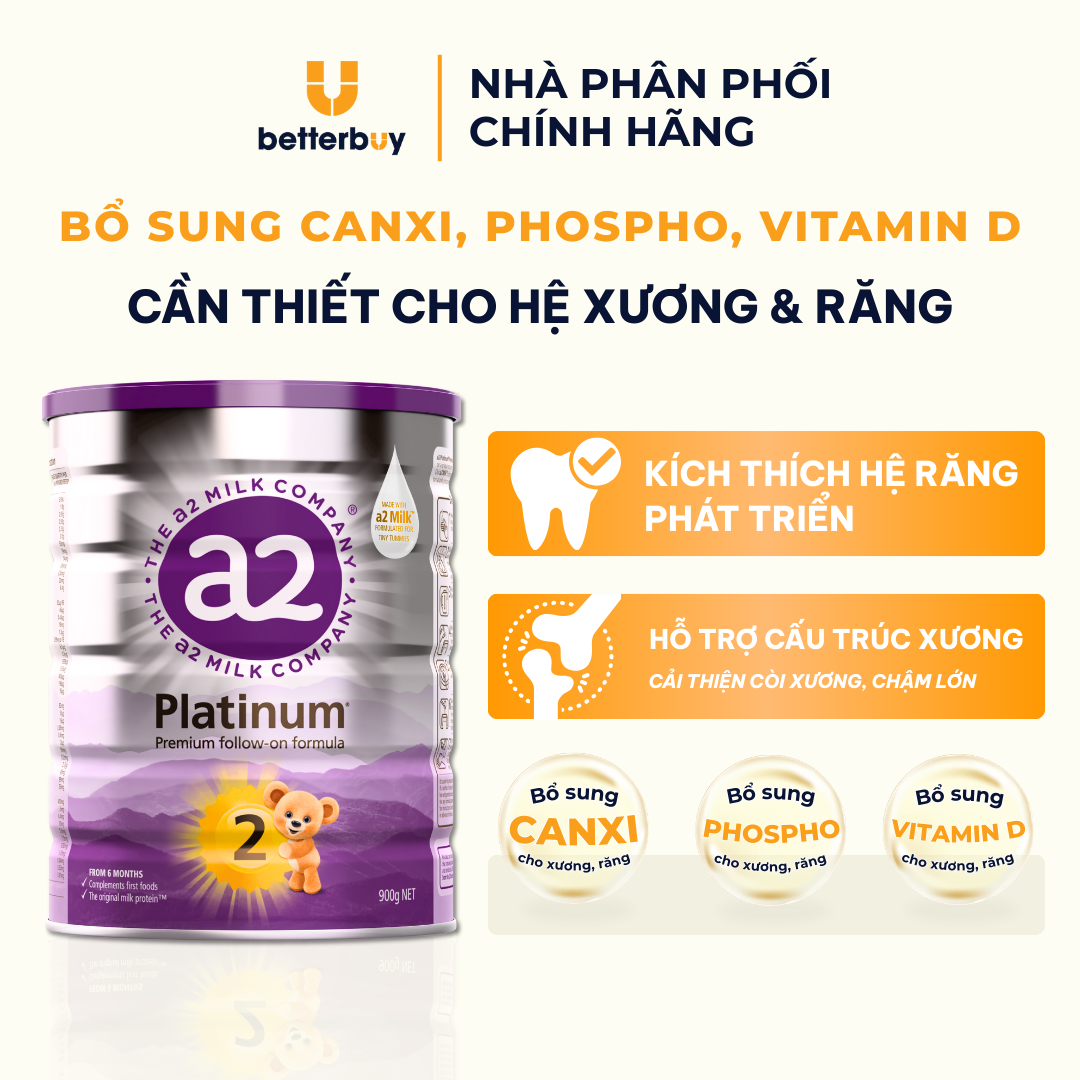 a2 Platinum Premium - Sữa công thức cao cấp nhập khẩu trực tiếp từ New Zealand, 100% đạm A2 chuyên hỗ trợ tiêu hóa và phát triển toàn diện cho trẻ từ 6-12 tháng. Thông tin sản phẩm ◈ Thương hiệu: The a2 Milk Company ◈ Xuất xứ: New Zealand ◈ Đối tượng sử dụng: Trẻ từ 6-12 tháng ◈ Khối lượng: 900g ◈ Hạn sử dụng: 24 tháng kể từ ngày sản xuất (Xem trên bao bì) Lợi ích nổi bật ◈ 100% đạm A2, không lẫn đạm A1: an toàn với hệ tiêu hóa nhạy cảm, giảm nôn trớ, táo bón, khó tiêu ◈ Bổ sung chất xơ GOS: cân bằng hệ vi sinh đường ruột, kích thích trẻ ăn ngon, ngủ ngon ◈ Kẽm, Vitamin B1, B12: Hỗ trợ dinh dưỡng và kích thích ăn ngon cho bé trong giai đoạn ăn dặm. ◈ Bổ sung DHA, EPA: phát triển trí não, thị giác, tăng cường khả năng tư duy - quan sát ◈ Canxi, Phospho và Vitamin D: hệ xương và răng chắc khỏe, hỗ trợ tăng trưởng chiều cao. ◈ 25 vitamin & khoáng chất thiết yếu: tăng cường đề kháng & miễn dịch khỏe mạnh Hướng dẫn sử dụng ◈ Vệ sinh tay và dụng cụ pha thật kỹ, tiệt trùng trước khi dùng. ◈ Đun sôi nước, để nguội khoảng 30 phút (nhiệt độ khoảng 40°C). ◈ Dùng 1 muỗng gạt ngang pha với 50ml nước. ◈ Lắc đều cho đến khi tan hết bột. ◈ Kiểm tra nhiệt độ sữa trước khi cho bé uống. ◈ Dùng ngay sau khi pha. Bỏ phần thừa sau 1 giờ. Hướng dẫn bảo quản ◈ Bảo quản nơi thoáng mát, khô ráo. ◈ Đóng kín nắp sau mỗi lần sử dụng. ◈ Sau khi mở nắp, sử dụng trong vòng 4 tuần. ◈ Không bảo quản trong tủ lạnh. ◈ Dùng dụng cụ khô, sạch để lấy sữa – không làm ướt muỗng. Cam kết ◈ Đại lý phân phối chính thức của The a2 Milk Company - Cam kết sản phẩm chính hãng 100%. ◈ Sản phẩm giá tốt - còn hạn sử dụng xa. Lưu ý ◈ Sữa mẹ là thức ăn tốt cho trẻ sơ sinh và trẻ nhỏ. Chỉ sử dụng sữa công thức khi mẹ thiếu sữa hoặc theo chỉ định chuyên gia y tế ◈ Không dùng cho người dị ứng với sữa bò, cá hoặc đậu nành.