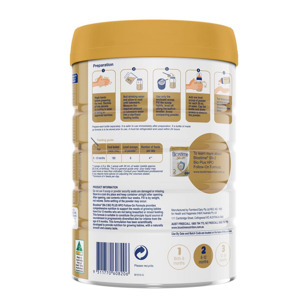 - Giúp trẻ dễ tiêu hóa và hấp thu dinh dưỡng tốt hơn, tăng cân đều. THÀNH PHẦN Milk Solids (Lactose, Skim Milk, Whey Protein), Vegetable Oils (Rapeseed Oil, Coconut Oil, Sunflower Oil, Soybean Oil, Antioxidant [Ascorbyl Palmitate]), Arachidonic Acid (ARA), 2′-O-fucosyllactose (2′-FL), Docosahexaenoic Acid (DHA) (From Fish), Choline, Inositol, Taurine, Culture (Bifidobacterium infantis), L-Carnitine, Emulsifier (Soy Lecithin) Khoáng chất: Calcium, Chloride, Copper, Iodine, Iron, Magnesium, Manganese, Phosphorus, Potassium, Selenium, Sodium, Zinc Các loại Vitamin: Biotin, Folic Acid, Niacin, Pantothenic Acid, Riboflavin, Thiamin, Vitamin A, Vitamin B6, Vitamin B12, Vitamin C, Vitamin D, Vitamin E, Vitamin K CHỨA SỮA, CÁ VÀ CÁC SẢN PHẨM ĐẬU NÀNH Nguồn protein trong Biostime SN-2 BIO PLUS HPO Follow-On Formula có nguồn gốc từ sữa bò.
