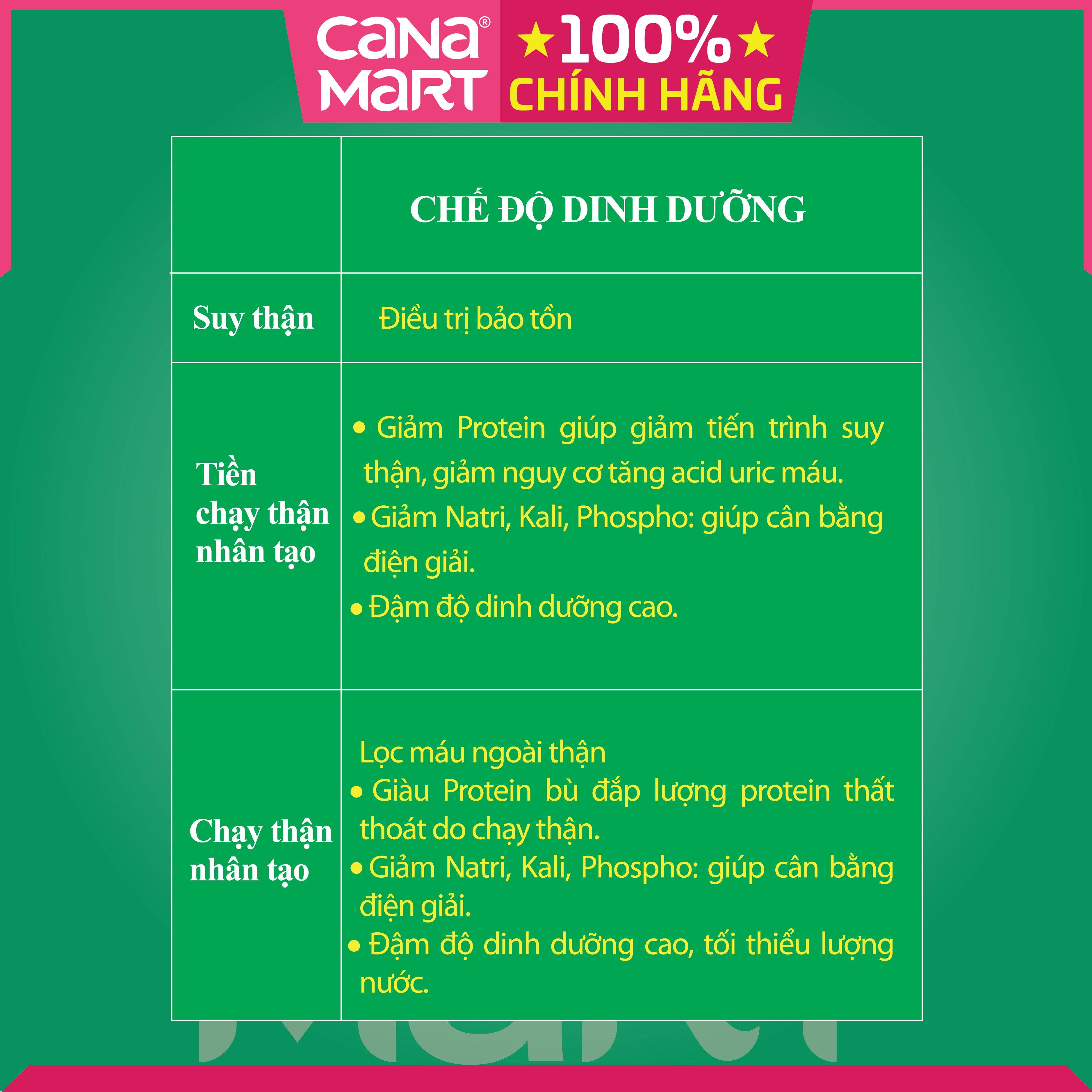GIẢM PROTEIN & GIÚP CÂN BẰNG ĐIỆN GIẢIProtein thấpgiúp giảm Urê máu, giảm tải cho hoạt động của thận.Ít Natri - Kali - Phốtpho giúp cân bằng điện giải, giảm tải hoạt động cho thận, giảm tì...