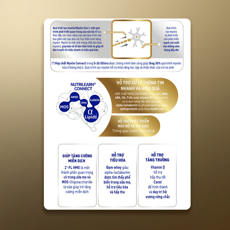- Sở hữu Công thức đầu tiên tại Việt Nam - Hợp chất độc quyền NUTRILEARN CONNECT, gồm (1) hệ dưỡng chất MYELIN CONNECT, (2) Choline & Lutein, (3) HMO & MOS.