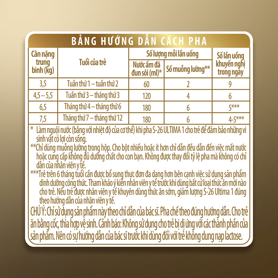 - Chú ý: Nước phải được đun sôi, dụng cụ pha chế phải được luộc kỹ. Bảo quản, pha chế và cho trẻ uống không đúng cách có thể dẫn đến những tác dụng không mong muốn cho sức khỏe của trẻ. Không pha sẵn sữa để dự trữ. Sử dụng trong vòng 4 tuần sau khi mở hộp. Hướng dẫn bảo quản