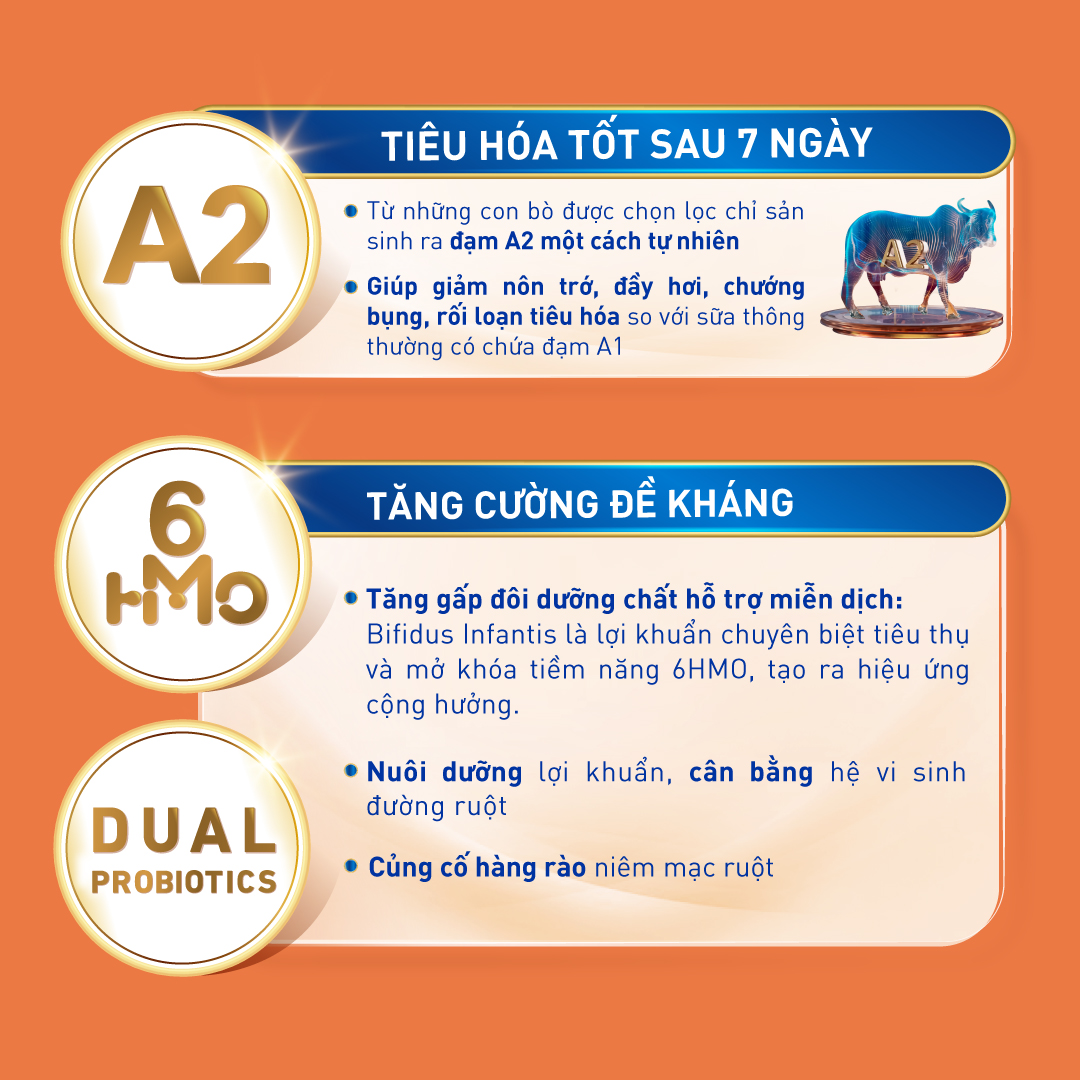 Thành phần: LACTOSE (từ SỮA-from MILK), Hỗn hợp dầu (dầu hướng dương giàu acid Oleic, dầu hạt cải có hàm lượng acid Erucic thấp, dầu hướng dương, dầu nấm Mortierella alpina, dầu vi tảo Schizochytrium sp., chất chống oxy hóa (Tocopherol concentrat dạng hỗn hợp, Ascorbyl palmitat)), WHEY khử khoáng (từ SỮA-WHEY PROTEIN from MILK), SỮA A2 tách kem 11% (A2 Skimmed MILK powder), Các khoáng chất (Calci citrat, Kali citrat, Kali Clorid, Magnesi Clorid, Natri citrat, Dikali hydro phosphat, Natri clorid, Sắt (II) sulphat, Kẽm sulfat, Đồng sulfat, Mangan sulfat, Kali iodid, Natri selenat), Các vitamin (C, B5, Nicotinamid, B2, A, B1, B6, K1, Acid folic, Biotin, D3, B12), Oligosaccharide (2'-Fucosyllactose, Lacto-N-tetraose, 3-Fucosyllactose, 6'-Sialyllactose, Difucosyllactose, 3'-Sialyllactose), Maltodextrin, Chất nhũ hóa Lecithin ĐẬU NÀNH (SOYA lecithin), Choline Bitartrate, L-Phenylalanine, Inositol, Taurine, Lợi khuẩn (Bifidobacterium longum subsp. infantis, Bifidobacterium lactis), L-Histidine, Nucleotide (Uridine, Cytidine, Adenosine, Guanosine), L-Carnitine, Chất điều chỉnh độ acid Acid citric.