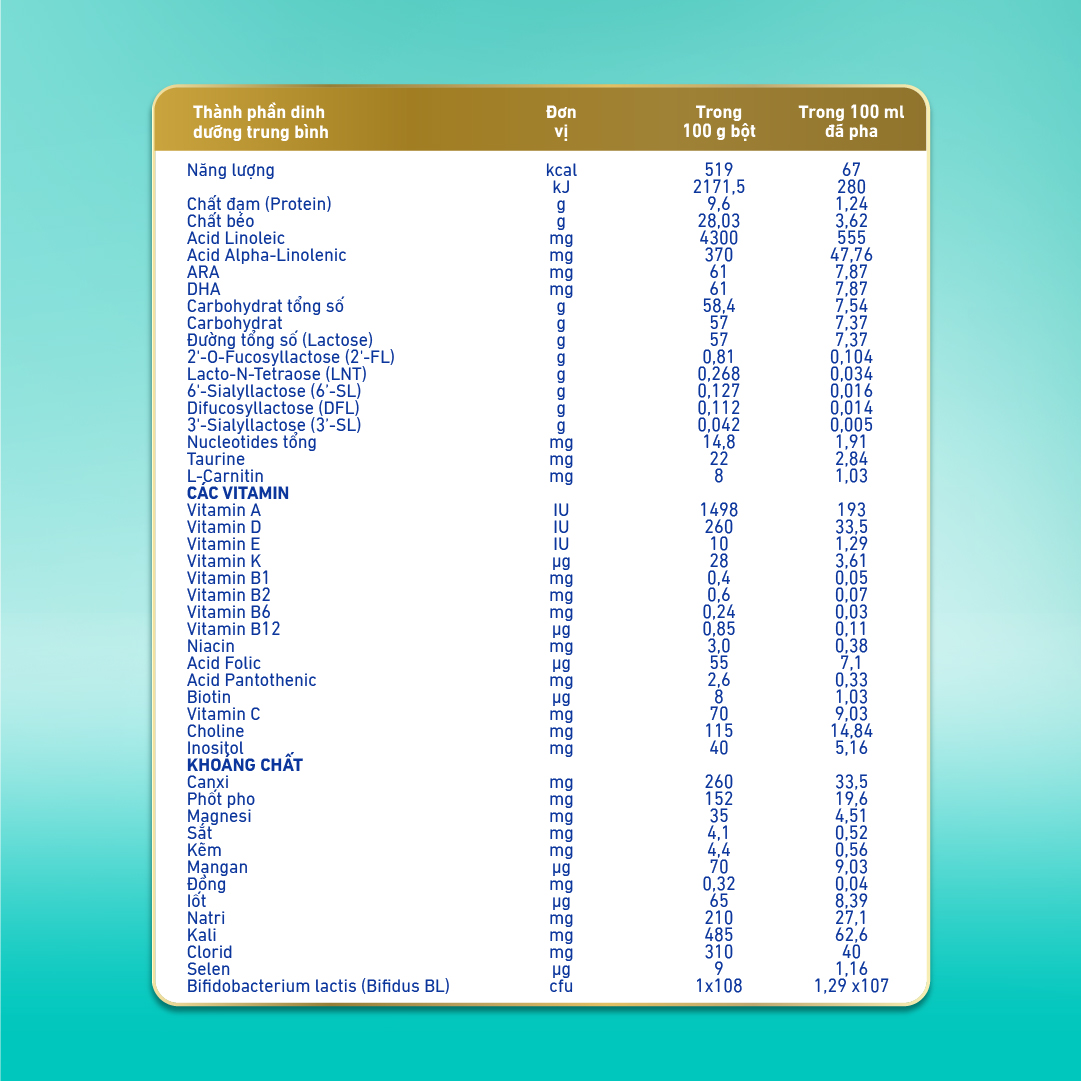 Thành phần: LACTOSE (từ SỮA-from MILK), ĐẠM chất lượng OPTIPRO(ĐẠM WHEY, ĐẠM CASEIN từ SỮA-WHEY, CASEIN PROTEIN from MILK), Dầu hướng dương giàu axit oleic, SỮA tách kem (MILK skimmed), Dầu hạt cải có hàm lượng axit erucic thấp, 2'-Fucosyllactose (2’-FL), Tricalci citrat, Kali citrat, Chất nhũ hóa Lecithin ĐẬU NÀNH (SOYA lecithin), Maltodextrin, Lacto-N-Tetraose (LNT), Choline Bitartrate, Dầu CÁ ngừ giàu DHA (Oil FISH Tuna high DHA), Kali clorid, Magnesi chlorid, Trinatri citrat, Dikali hydro phosphat, L-Phenylalanine, Dầu nấm giàu ARA, Natri clorid, 6'-Sialyllactose (6’-SL), Natri ascorbat (Vitamin C), Difucosyllactose (DFL), Myo-Inositol, Taurine, 3'-Sialyllactose (3’-SL), Sắt (II) Sulphat, L-Histidine, Kẽm Sulfat, L-Carnitine, Cytidine 5', DL-alpha-tocopheryl acetat (Vitamin E), Uridine 5’, Nicotinamid, Adenosine 5', D-pantothenat calci (Vitamin B5), Bifidobacterium lactis (Bifidus BL), Đồng sulfat, Guanosine 5’, Thiamin mononitrat (Vitamin B1), Retinyl acetat (Vitamin A), Riboflavin (Vitamin B2), Pyridoxin hydroclorid (Vitamin B6), Mangan sulfat, Kali iodid, Axit folic, Phytomenadion (Vitamin K1), Natri selenat, D-biotin (Vitamin B7), Cholecalciferol (Vitamin D3), Cyanocobalamin (Vitamin B12).