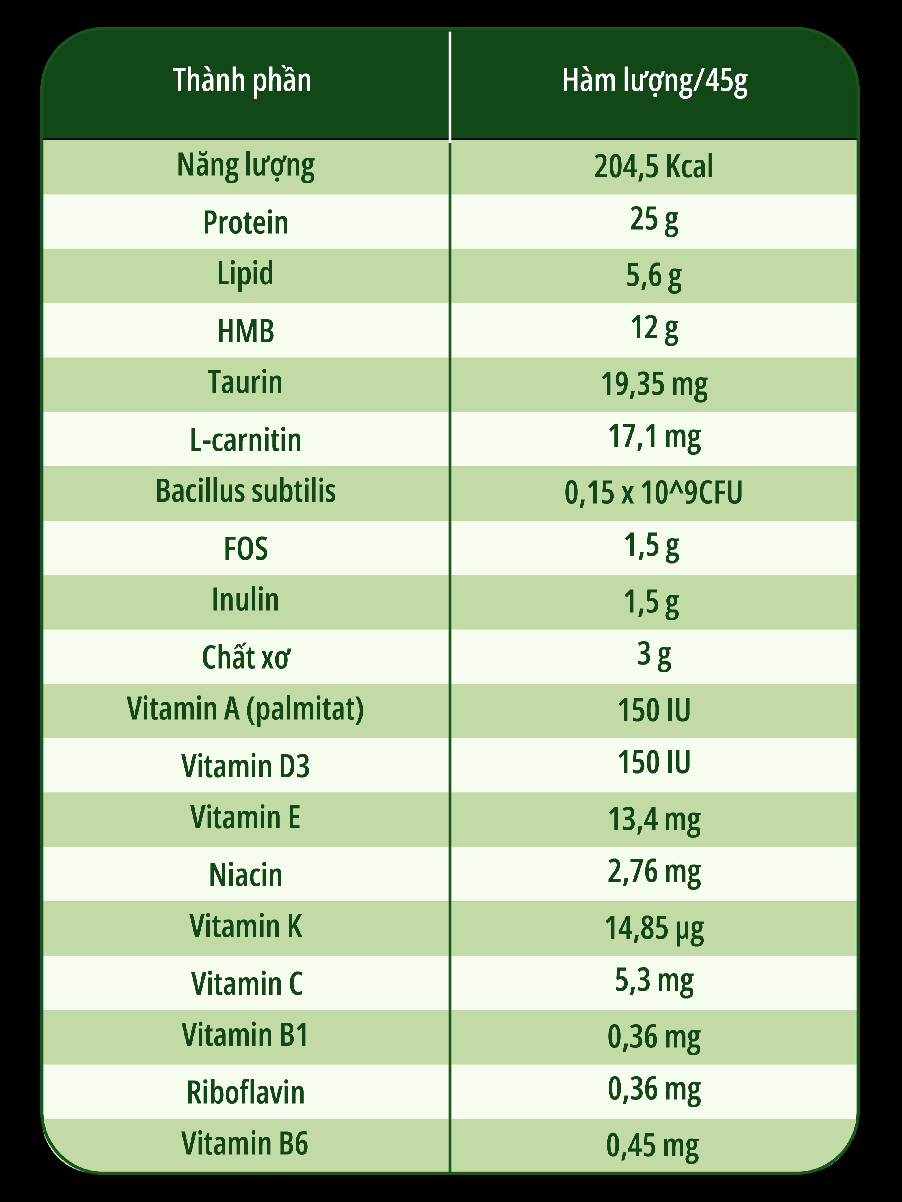 Công dụng TỐT CHO CƠ - XƯƠNG: Giàu đạm quý Arginine & BCAA giúp tưng cường hệ cơ. Giàu Canxi, vitamin D3 cùng Magie, đặc biệt tỷ lệ Canxi/Phospho đạt chuẩn khuyến nghị Quốc gia