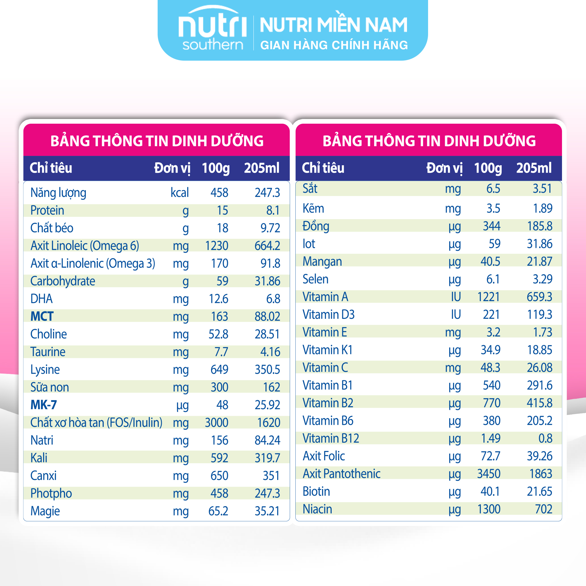 THÀNH PHẦN: Sữa bột nguyên kem bổ sung Vitamin A và D3, bột sữa (bột sữa tách béo, hỗn hợp dầu thực vật (dầu cọ, dầu bắp, dầu hạt cải, dầu hướng dương), glucose syrup,