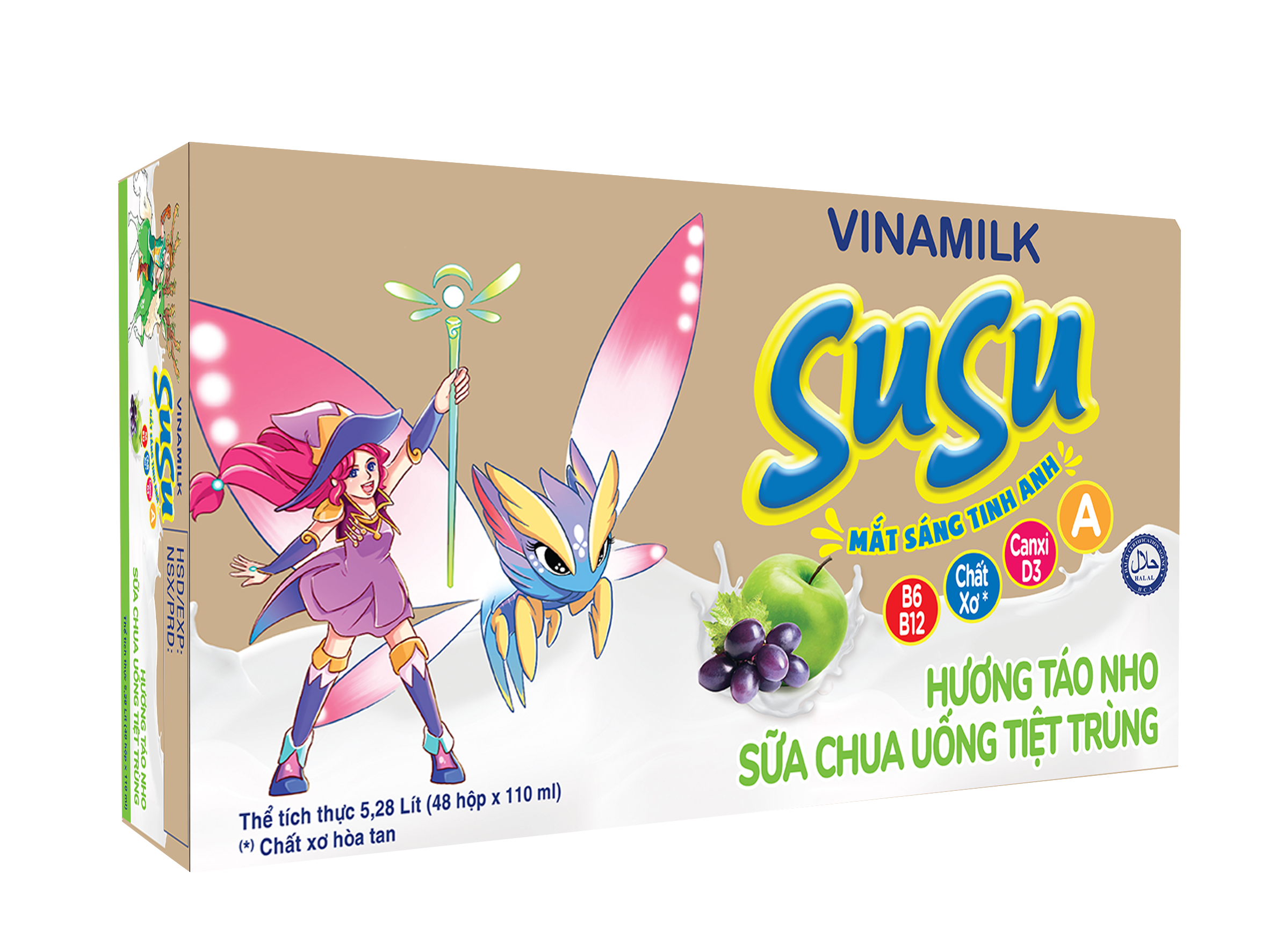 - Sữa chua uống Vinamilk SuSu mới – công thức đột phá Vitamin A giúp bé mắt sáng tinh anh, ngoài ra còn có Vitamin B6, B12 và chất xơ hòa tan giúp bé khỏe