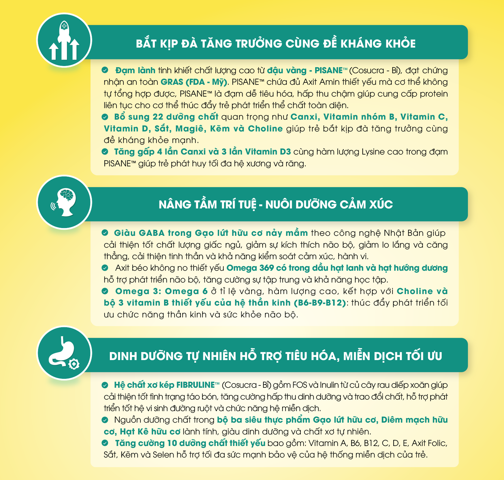 Thay thế bữa ăn phụ hoặc bổ sung cho chế độ ăn hàng ngày thiếu vi chất dinh dưỡng Giúp phát triển trí não và thị giác Giúp phát triển chiều cao Tăng cường sức
