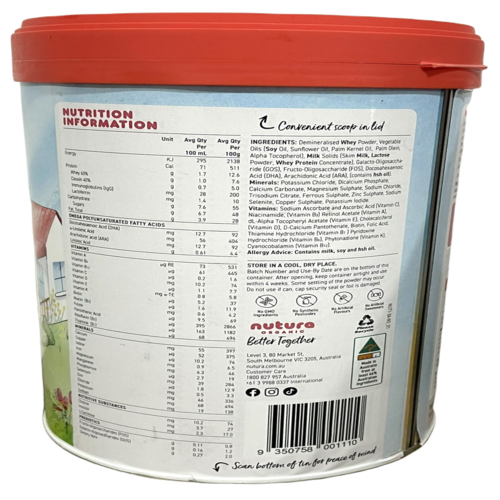 - Bảo quản: Bảo quản nơi khô ráo, thoáng mát. Sau khi mở, đóng nắp hộp kín và sử dụng trong vòng 4 tuần. Bột sữa có thể bị lắng. Không sử dụng nếu hộp, tem niêm phong an toàn trên nắp hoặc giấy bạc bị hỏng.