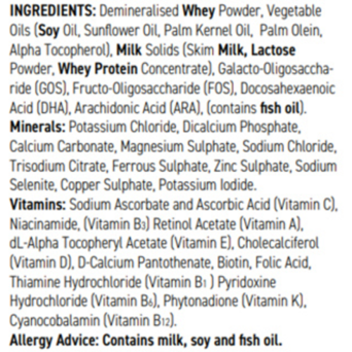 - Thành phần: Bột whey khử khoáng, dầu thực vật (dầu đậu nành, dầu hướng dương, dầu hạt cọ, dầu cọ, alpha tocopherol), sữa đặc (sữa tách béo, bột lactose, whey protein cô đặc), galacto-oligosaccharide (GOS), fructo-oligosaccharide (FOS), acid docosahexaenoic (DHA), acid arachidonic (ARA), (chứa dầu cá). Các khoáng chất: kali clorid, dicalci phosphat, calci carbonat, magnesi sulphat, natri clorid, trinatri citrat, sắt sulphat, kẽm sulfat, natri selenit, đồng sulfat, kali iodid. Các vitamin: natri ascorbat và acid ascorbic (vitamin C), niacinamide (vitamin B3), retinol acetat (vitamin A), DL-alpha tocopheryl acetat (Vitamin E), cholecalciferol (Vitamin D), D-calci pantothenat, biotin, acid folic, thiamin hydroclorid (Vitamin B1), pyridoxin hydroclorid (Vitamin B6), phytonadione (Vitamin K), cyanocobalamin (Vitamin B12).