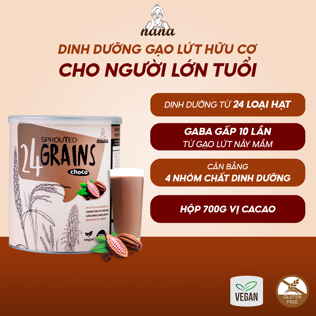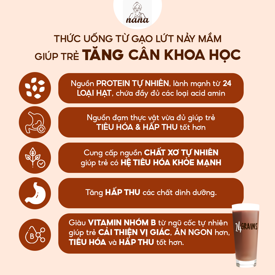 - 24 loại hạt "siêu thực phẩm": nhóm ngũ cốc - nhóm hạt giàu chất béo tốt - nhóm giàu chất xơ hòa tan, vitamin & khoáng chất - nhóm hạt giàu đạm hoàn chỉnh dễ tiêu hóa. DINH DƯỠNG TỪ GẠO LỨT HỮU CƠ VỚI CÔNG NGHỆ NẢY MẦM Hạt nảy mầm thương mại được chế biến trong môi trường vô trùng và thường được sấy khô hoặc khử nước trước khi đóng gói để ngăn ngừa nấm mốc cũng như nguy cơ bệnh tật do thực phẩm, vì khó tạo ra một môi trường vô trùng tại nhà. 24Grains giàu dinh dưỡng & các loại vitamin khoáng chất từ hạt gạo lứt hữu cơ nảy mầm. Trong quá trình nảy mầm, hàm lượng các vitamin, khoáng chất & đạm đều tăng lên rõ rệt. Các dưỡng chất quan trọng như GABA, lysin, Vitamin E, magie, chất xơ, niacin, B1, B6 & B12 cũng được tìm thấy trong hạt nảy mầm với giá trị đặc biệt cao. BỔ SUNG TRỌN VẸN DƯỠNG CHẤT TỰ NHIÊN CHO TRẺ TỪ 3 TUỔI