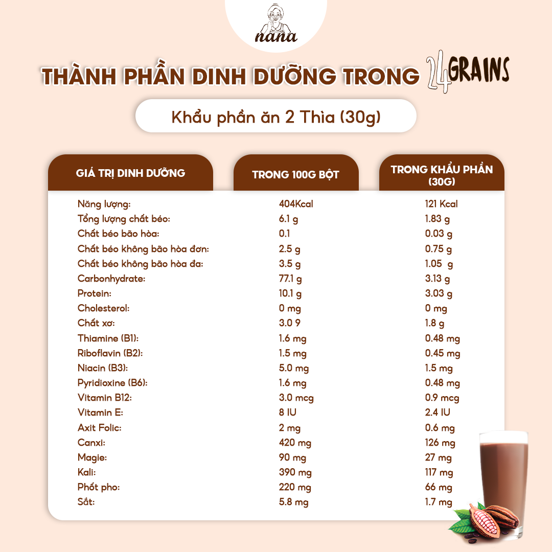 - Thành phần: Gạo lứt hữu cơ nảy mầm, hạt kê, hạt diêm mạch, kiều mạch, đậu đen, đậu đỏ, ngô, hạt thông, bạch quả, óc chó, hạt sen, câu kỷ tử, đậu xanh, đậu lăng, đại mạch, gạo huyết rồng, yến mạch nguyên hạt, hạt hướng dương, omega 369 (từ hạt lanh), lúa mạch đen, lúa mì nâu, protein từ đậu Hà Lan, bột cacao, lecithin từ đậu nành, chất xơ prebiotic, isomaltulose. SP của OMEGA HEALTH PRODUCTS SDN BHD NSX: NOVASONN SDN BHD MALAYSIA NK&PP tại VN: CÔNG TY TNHH THỰC PHẨM NP 3 THÀNH PHẦN CHÍNH TỰ NHIÊN CỦA 24GRAINS: