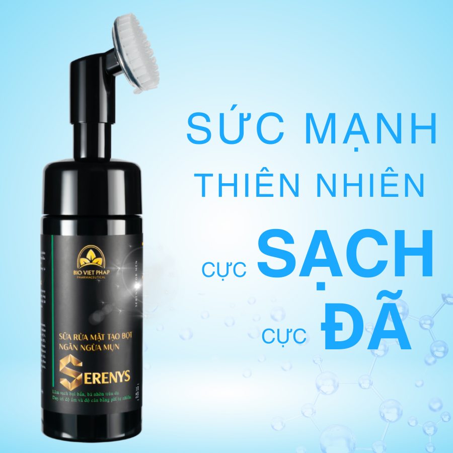 SỮA RỬA MẶT DẠNG BỌT TUYẾT SERENYS     Sữa rửa mặt dạng bọt tuyết Serenys , làm sạch sâu ngăn ngừa mụn là sản phẩm chăm sóc da mụn từ tinh dầu Tràm trà hoàn toàn từ thiên nhiên. Sản phẩm không chứa các hóa chất gây hại cho da như hương liệu, phẩm màu, cồn, dầu khoáng, paraben. Có thể sử dụng hàng ngày để giúp da luôn sạch khỏe, trắng sáng và mịn màng.   HƯỚNG DẪN SỬ DỤNG SỮA RỬA MẶT DẠNG BỌT TUYẾT SERENYS Sữa rửa mặt tạo bọt ngăn ngừa mụn Serenys là sản phẩm vệ sinh hàng ngày chuyên biệt dành cho nam giới. Gồm 3 bước đơn giản sau: