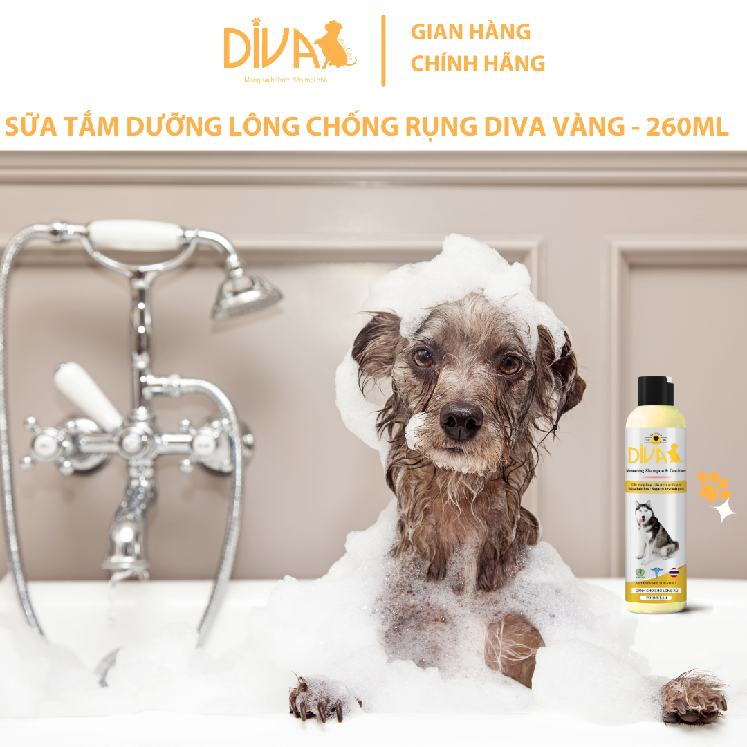 - Sữa tắm dưỡng ẩm khử mùi Diva vàng có tác dụng dưỡng da mềmmại và giảm rụng lông. Giúp lưu lại hương thơm lâu dài cho cún yêu.