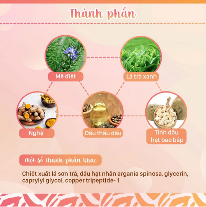 - Thành phần hữu cơ thiên nhiên: chiết xuất lá sơn trà, mê điệt, trà xanh, thảo dược lên men…
