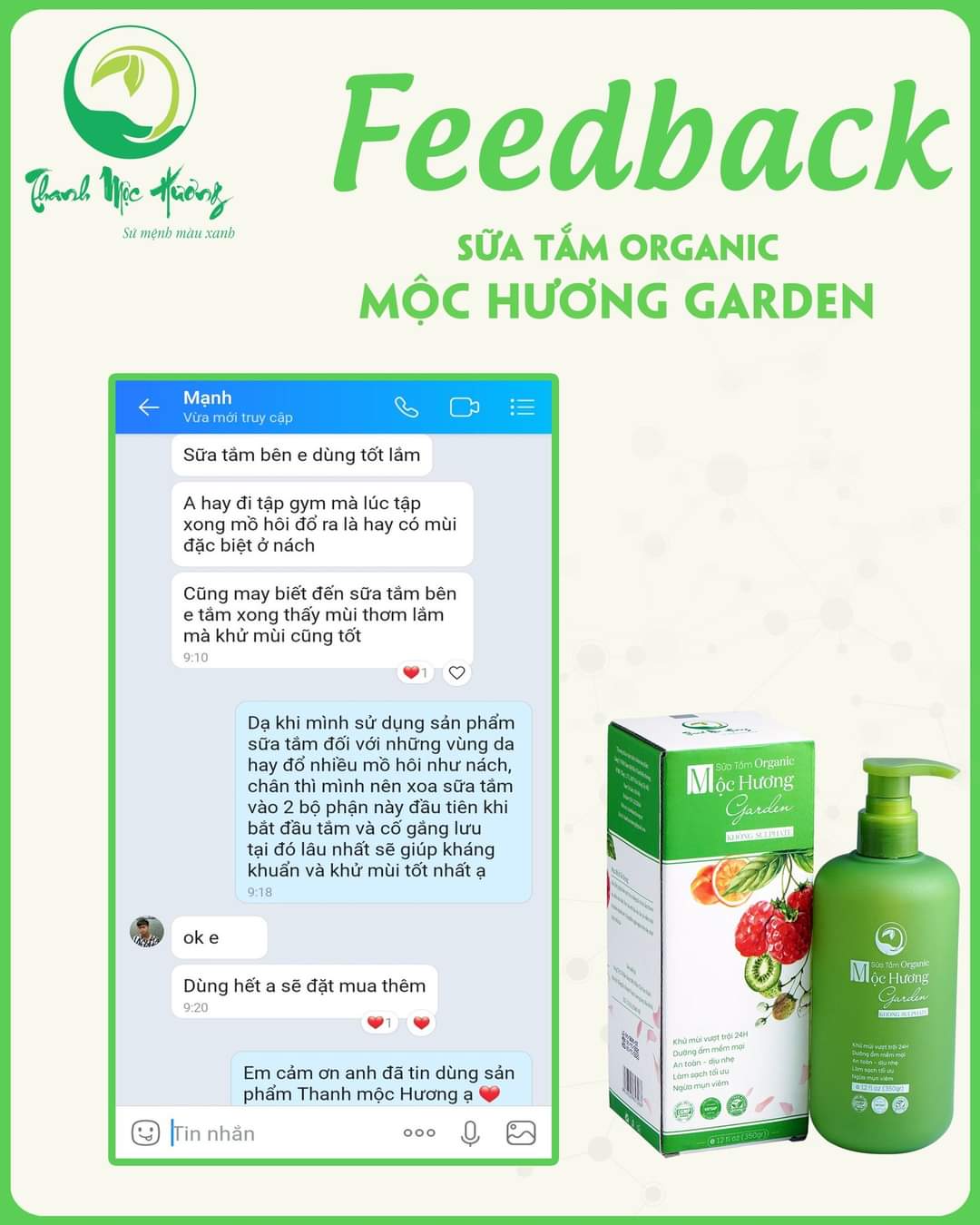 Sữa tắm trắng da ngăn ngừa rôm sảy mụn nhọt Thanh Mộc Hương 350ml THANH MỘC HƯƠNG RA MẮT SỮA TẮM ORGANIC MỘC HƯƠNG GARDEN - SỮA TẮM HOÀN TOÀN TỪ NHỮNG THÀNH PHẦN DƯỢC LIỆU TỰ NHIÊN Thêm một siêu phẩm đến từ nhà Thanh Mộc Hương – một sản phẩm nâng niu, yêu thương và là người bạn của làn da! Sữa tắm “trọn gói” tình yêu làm đẹp từ thiên nhiên vào trong sản phẩm. Mùi của em nó là mùi tự nhiên của hoa quả quyện với hoa hồng và oải hương rất thư giãn.