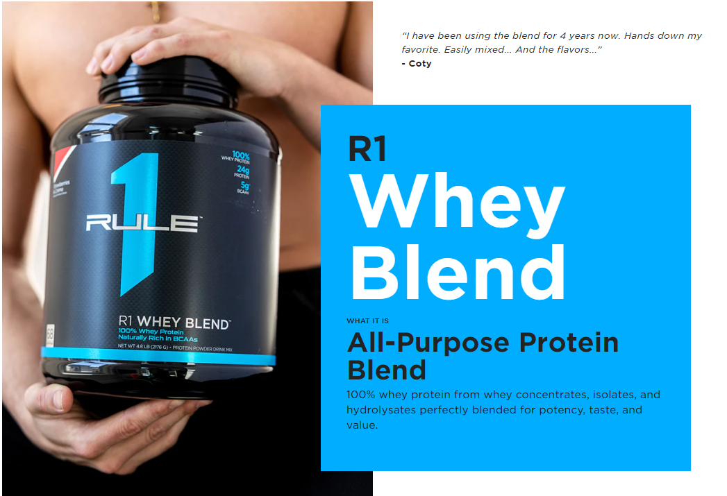 - HOW MUCH R1 WHEY BLEND SHOULD I TAKE? Nó thực sự phụ thuộc vào các yếu tố như cân nặng, chế độ ăn uống của bạn bao gồm những gì, tổng số calo bạn tiêu thụ và mức độ hoạt động của bạn. Một nguyên tắc chung trong thế giới thể hình là nhắm tới 1 gram protein cho mỗi pound trọng lượng cơ thể/mỗi ngày. Nói cách khác, một vận động viên 200 lb nên nhắm mục tiêu 200 g tổng protein từ tất cả các nguồn thực phẩm bao gồm bột protein và các chất bổ sung khác.