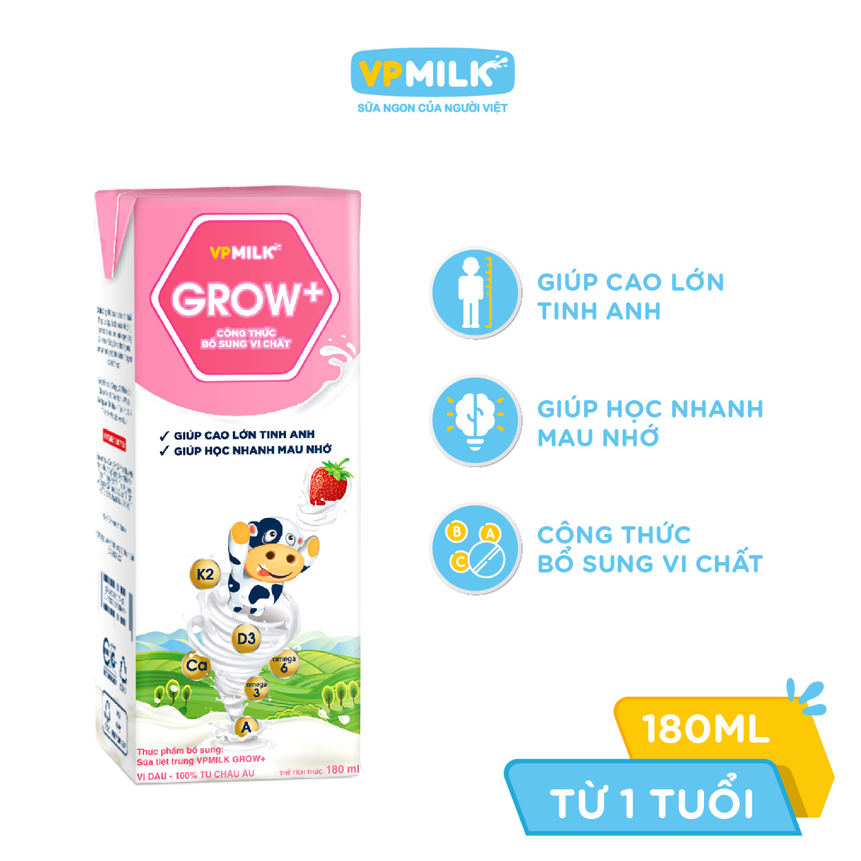 Sữa Tiệt Trùng VPMilk Grow+ là loại sữa phù hợp cho trẻ từ 1 tuổi trở lên. Sản phẩm được nghiên cứu theo thể trạng của trẻ em Việt Nam sẽ đồng hành cùng mẹ nhằm đem đến nền tảng khoẻ mạnh tự nhiên cho bé yêu. Với Sữa Tiệt Trùng VPMilk Grow+ giờ đây mẹ đã có thể yên tâm và tự tin rằng đã có một giải pháp hoàn hảo để con yêu có thể phát triển cao lớn vượt trội, giúp con thêm tự tin, vững bước thành công trong tương lai.