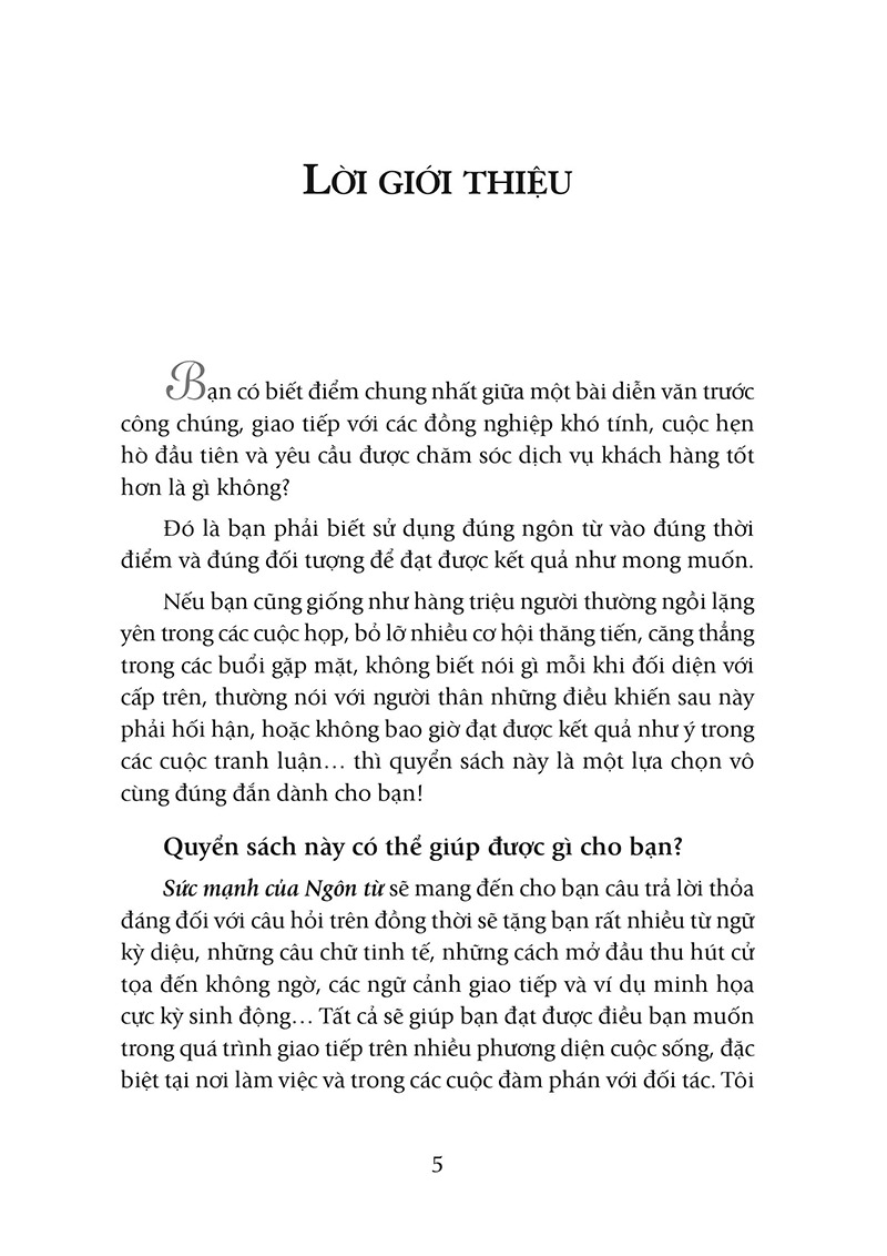 • Để đạt được những điều bạn mong muốn, giao tiếp chính là chiếc chìa khóa đầu tiên Chắc chắn Sức mạnh của Ngôn từ sẽ giúp bạn đạt được điều bạn muốn trong quá trình giao tiếp trên nhiều phương diện cuộc sống: gia đình, bạn bè,… đặc biệt tại nơi làm việc và trong các cuộc đàm phán với đối tác. Tin rằng khi áp dụng những chiến lược, bí quyết và kỹ năng giao tiếp này, bạn sẽ trở nên tự tin, cuốn hút, chuyên nghiệp và gặt hái nhiều thành công hơn nữa.