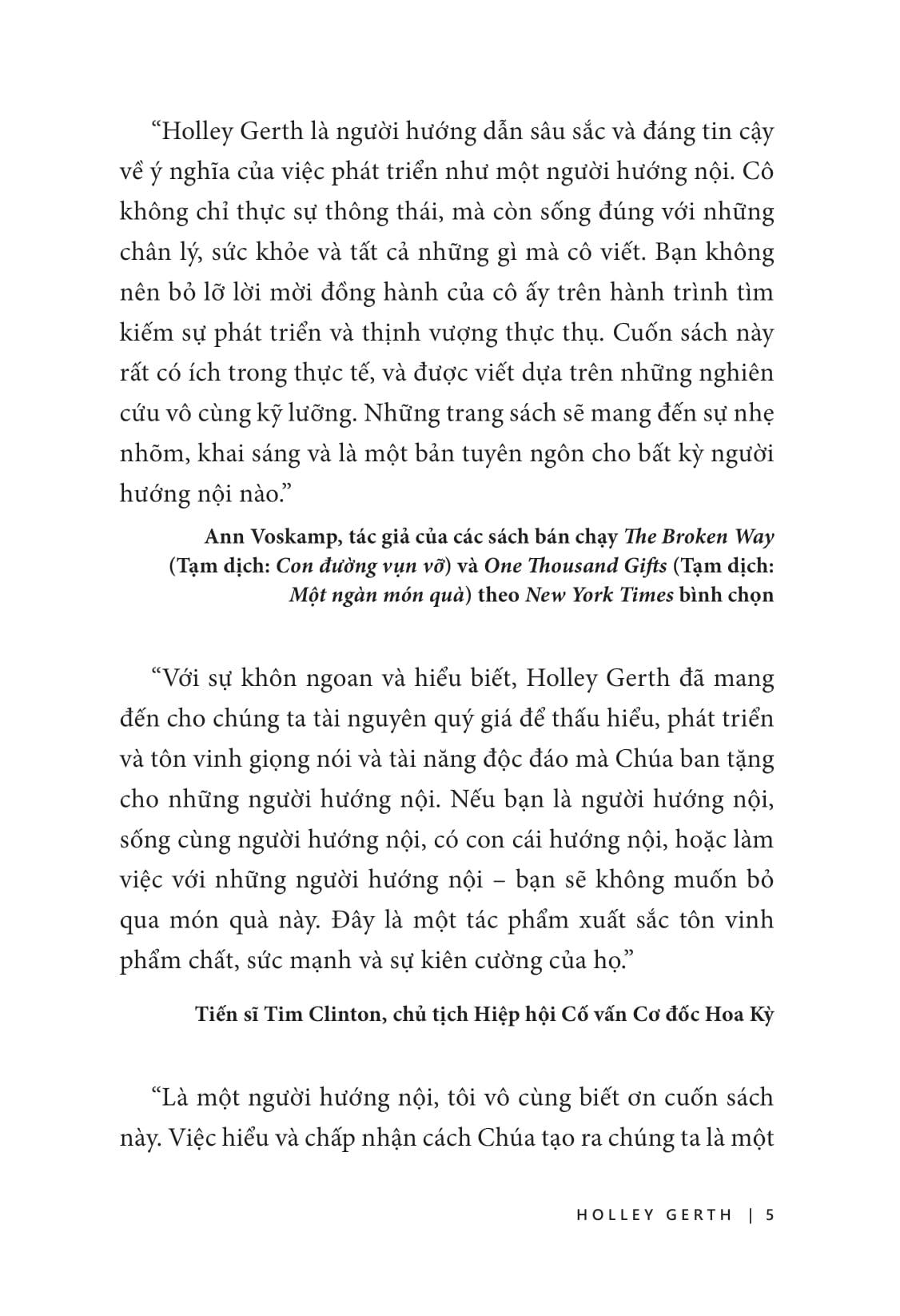 Trong cuốn sách Sức mạnh của người hướng nội – Lý do thế giới cần BẠN là CHÍNH BẠN, Holley Gerth đi sâu vào khoa học não bộ đằng sau tính hướng nội để giúp bạn hiểu các khía cạnh tâm lý, quan hệ và tinh thần của việc là một người hướng nội, từ đó cung cấp cái nhìn tổng quan toàn diện về tính hướng nội và khám phá cách người hướng nội có thể khai thác toàn bộ tiềm năng của m.ình.