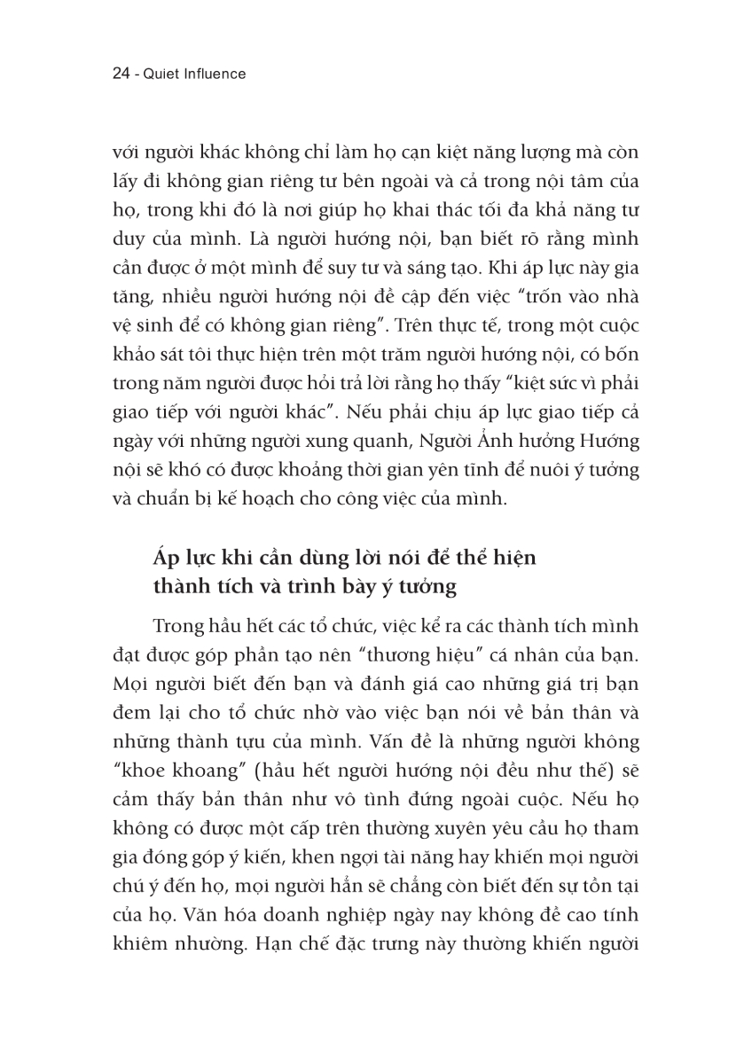 Không ít người hướng nội đang gồng mình để trở thành những người trông-có-vẻ năng động, hoạt náo, và giỏi quảng giao, sống theo kiểu của người hướng ngoại. Khi chỉ còn một mình, rất nhiều người trong số ấy cảm thấy như kiệt sức sau những “vai diễn” của mình ở chốn công sở, ngoài xã hội, trước mặt bạn bè, thậm chí là người thân. Cũng bởi chúng ta đang sống trong thời đại mà “mọi người vẫn tin rằng phải khoa trương ầm ĩ mới có thể làm nên điều khác biệt”, rất nhiều người hướng nội như bạn đang cố nhào nặn chính mình để sống theo “lý tưởng hướng ngoại”.