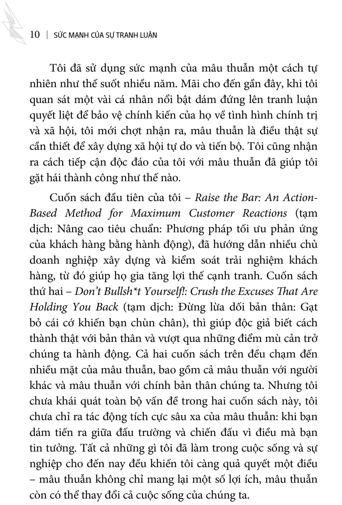 “Sức mạnh của sự tranh luận” sẽ hướng dẫn bạn phương pháp này thông qua nhiều ví dụ thực tiễn trong cuộc đời và sự nghiệp của chính tác giả cũng như cuộc đời của những người khác, những người đủ can đảm để đương đầu với mâu thuẫn và đã cải thiện cuộc sống, đạt được thành công.