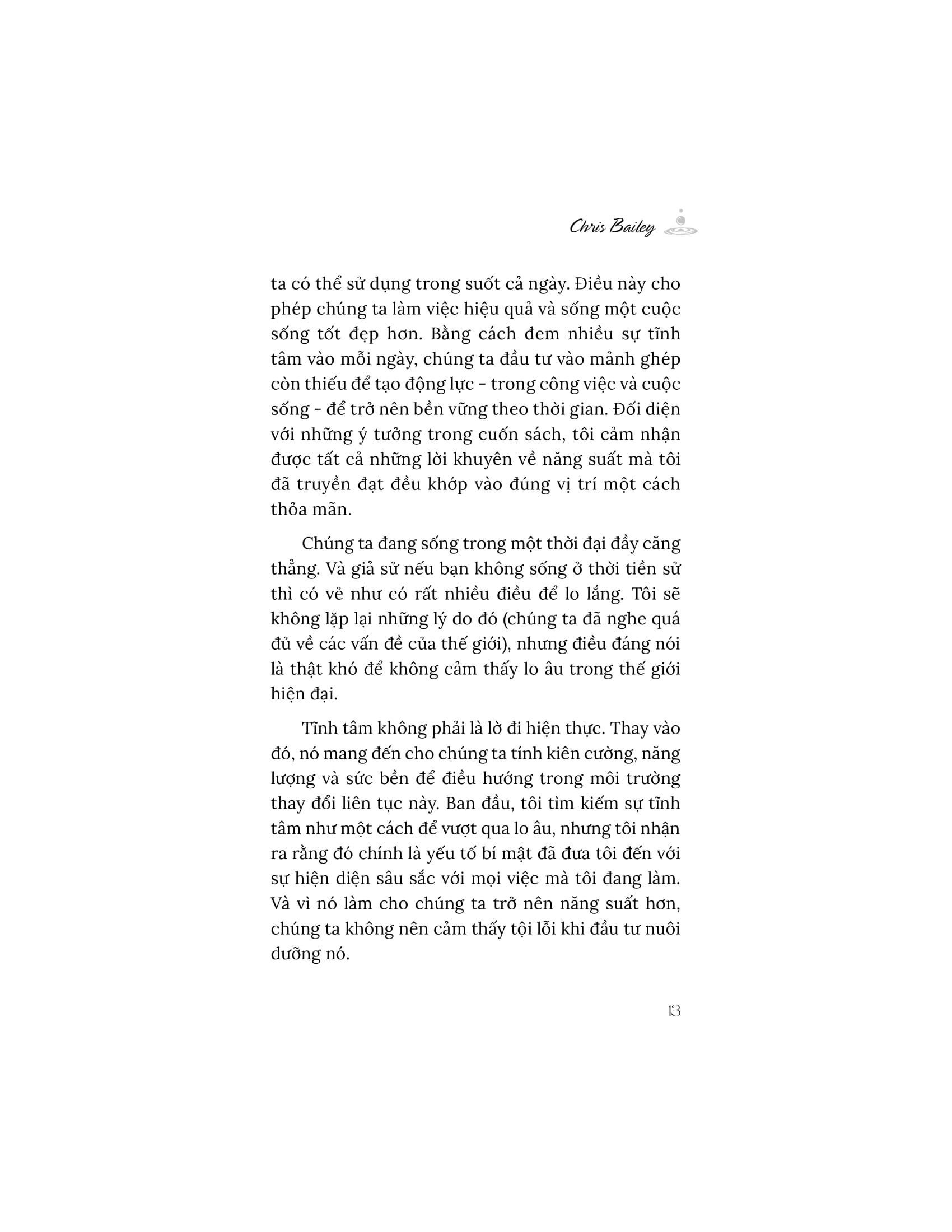 Chris Bailey là chuyên gia về năng suất và là tác giả sách bán chạy của hai cuốn sách về năng suất: Hyperfocus và The Productivity Project. Chris viết về năng suất tại và nói chuyện với các tổ chức trên toàn cầu về cách để họ có thể trở nên năng suất