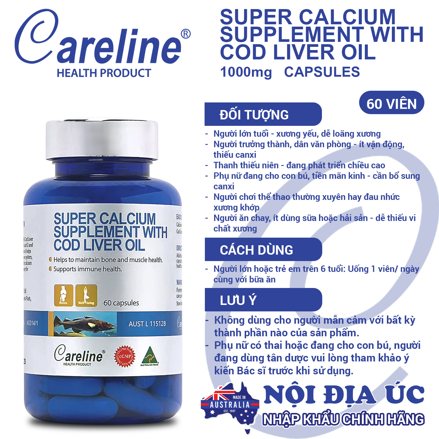 Nhập khẩu chính hãng từ Careline Úc - Có tem, nhãn phụ, mã vạch đầy đủ - Đạt chuẩn cGMP - Chứng nhận chất lượng quốc tế