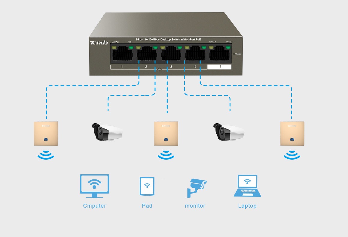 - TEF1106P-4-63W là switch PoE unmanaged với 2 cổng uplink, được thiết kế riêng bởi Tenda - Tương thích với PoE chuẩn IEEE 802.3at/af , tự động phát hiện các thiết bị sử dụng PoE