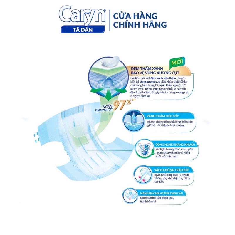 - Tã dán Siêu thấm Caryn cải tiến mới với “Đệm thấm xanh" chuyên biệt tại vùng xương cụt, với các hạt thấm hút tăng cường giúp thấm hút tối đa, ngăn thấm ngược trở lại đến 97%, cho vùng xương cụt thêm khô thoáng, giảm nỗi lo các vấn đề về da, là lựa chọn tốt nhất cho người dùng hạn chế khả năng đi lại. Thiết kế mở tiện thay trong tư thế nằm giúp việc chăm sóc trở nên thật dễ dàng.