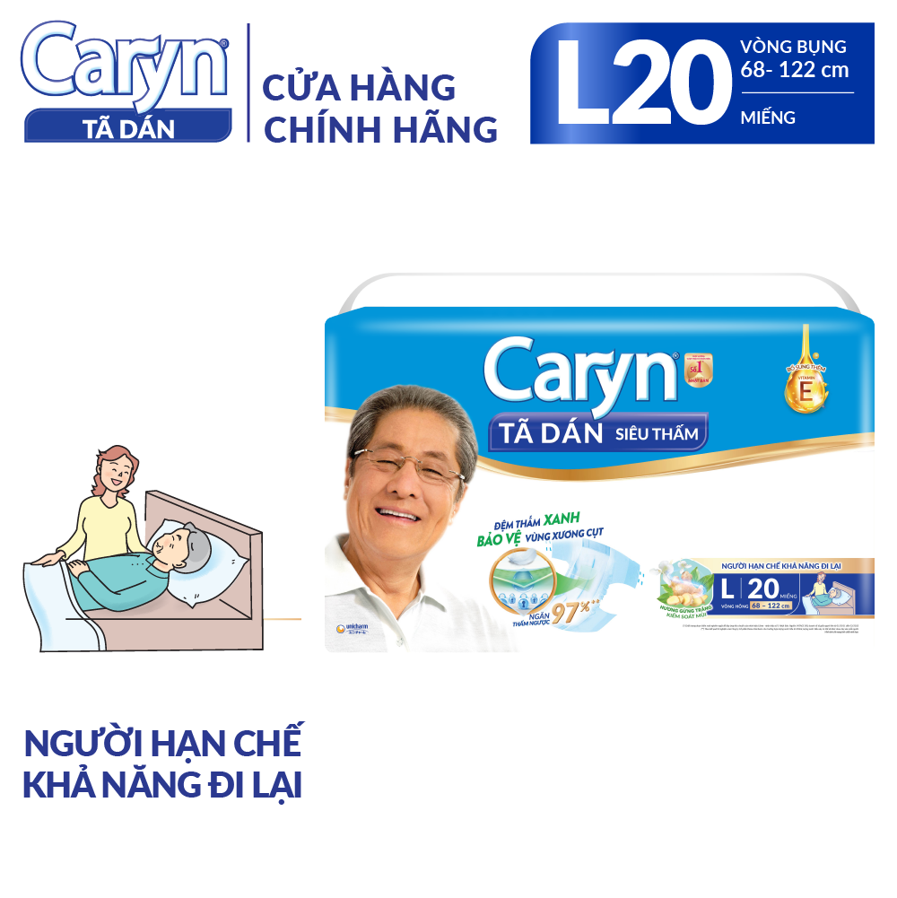 Tã dán Caryn L20 Siêu thấm Đệm thấm xanh bảo vệ vùng xương cụt (20 Miếng) Tã dán Siêu thấm Caryn L20 (mẫu cũ Caryn ML20) cải tiến mới với “Đệm thấm xanh" bảo vệ vùng xương cụt, với các hạt thấm hút tăng cường giúp thấm hút tối đa, ngăn thấm ngược trở lại đến 97%, cho vùng xương cụt thêm khô thoáng, giảm nỗi lo các vấn đề về da, là lựa chọn tốt cho người dùng hạn chế khả năng đi lại. Thiết kế mở tiện thay trong tư thế nằm giúp việc chăm sóc trở nên thật dễ dàng. Dùng cho phụ nữ sau sinh, người lớn gặp khó khăn trong việc vệ sinh như các bệnh nhân sau mổ, những người mất khả năng kiểm soát hệ bài tiết, người hạn chết khả năng đi lại (ngồi hoặc nằm 1 chỗ) Thông tin kích thước: Vòng hông: 68 đến 122 cm Hướng dẫn sử dụng - Mặc với sự trợ giúp của người nhà 1. Nghiêng người dùng sang bên, trải dọc miếng tã theo cơ thể người dùng 2. Xoay người dùng về tư thế nằm, căn chỉnh lại miếng tã cho vừa vặn 3. Kéo phần trước của miếng tã qua chân lên ngang bụng 4. Mở phần khóa dính, dán chéo vào nùng nilon có logo Caryn. Lưu ý, tay giữ vào phần màu xanh để giữ độ bám dính của khóa 5. Dán khóa dính 4 góc sao cho miếng tã ôm sát vào cơ thể người dùng. Điều chỉnh thêm phần mép miếng tã ôm sát đùi Lưu ý: Thay tã sau khoảng thời gian đều đặn và ngay sau khi người dùng tiêu bẩn Ngừng sử dụng và hỏi ý kiến bác sĩ nếu xuất hiện bất thường trên da