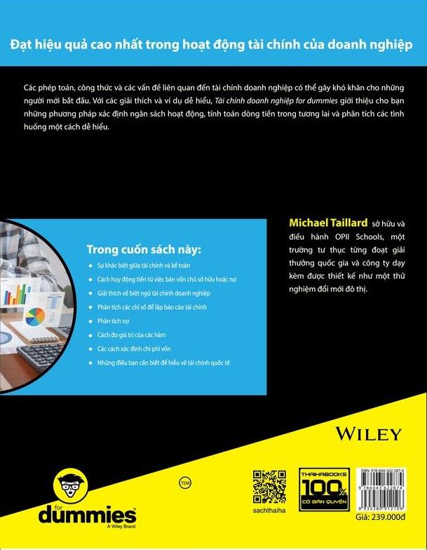 Các phép toán, công thức và các vấn đề liên quan đến tài chính doanh nghiệp có thể gây khó khăn cho những người mới bắt đầu. Với các giải thích và ví dụ dễ hiểu, Tài chính doanh nghiệp for dummies giới thiệu cho bạn những phương pháp xác định ngân sách hoạt động, tính toán dòng tiền trong tương lai và phân tích các tình huống một cách dễ hiểu. Trong cuốn sách này: · Sự khác biệt giữa tài chính và kế toán · Cách huy động tiền từ việc bán vốn chủ sở hữu hoặc nợ · Giải thích về biệt ngữ tài chính doanh nghiệp · Phân tích các chỉ số để lập báo cáo tài chính · Phân tích nợ · Cách đo giá trị của các hàm · Các cách xác định chi phí vốn · Những điều bạn cần biết để hiểu về tài chính quốc tế Mục lục: Cuốn sách gồm 6 phần: Phần 1: Tài chính doanh nghiệp có gì đặc biệt Phần này sẽ giống với mở đầu của bất kỳ cuốn sách nào khác, ngoại trừ việc nó hay hơn. Nó nói nhiều về tiền là gì, tài chính doanh nghiệp là gì và vai trò của nó, những người và tổ chức sử dụng thông tin tài chính doanh nghiệp (Gợi ý: nó bao gồm tất cả mọi người, dù bạn có nhận ra hay không). Phần 2: Đọc các báo cáo tài chính như một ngôn ngữ thứ hai Trước khi bạn làm được điều gì hữu ích với các thông tin tài chính, bạn cần phải biết được mình thực sự đang xem gì. Trừ khi bạn biết các báo cáo tài chính và các chỉ số rất đơn giản là gì, tại sao chúng được sử dụng, chúng sẽ chỉ như một mớ số má mà thôi. Đọc báo cáo tài chính dễ hơn rất nhiều so với học một ngoại ngữ, nhưng nhiều khả năng quá trình này cũng mới mẻ với bạn theo cách tương tự, do đó tôi đã dành vài chương để phân tích thật dễ hiểu. Phần 3: Định giá giá trị của doanh nghiệp Trước khi mua hoặc đầu tư vào thứ gì đó, làm thế nào bạn biết được nó đáng giá bao nhiêu, nhằm đảm bảo bạn sẽ kiếm ra tiền thay vì mất tiền? Hãy bắt đầu bằng cách đọc các chương ở Phần 3! Dù bạn muốn tìm hiểu về tài sản vốn, cổ phiếu, trái phiếu, hay phái sinh, tất cả các dạng tài sản chính mà bạn hy vọng biết cách định giá đều được đề cập ở đây! Phần 4: Vùng đất kỳ diệu quản lý rủi ro Tất cả các chương trong Phần 4 sẽ đi sâu vào rủi ro, cũng như một số chủ đề nâng cao hơn trong lĩnh vực tài chính doanh nghiệp mà với nhiều người, chúng như thể chui ra từ một vùng đất kỳ diệu điên rồ nào đó. Phần 5: Quản trị tài chính Hãy tìm hiểu một hai điều (hoặc nhiều hơn) về đánh giá kết quả tài chính, dự đoán kết quả tài chính tương lai, đánh giá kết quả của các doanh nghiệp khác để thâu tóm và sáp nhập (M&A). Suy cho cùng, điều cốt lõi là biết được cách quản lý tài sản và vốn sao cho tối ưu. Phần 6: Danh sách mười điều Cũng giống như các cuốn khác trong loạt sách For dummies, cuốn sách này cũng kết thúc bằng mục Danh sách mười điều. Phần có cái tên bí ẩn này bao gồm hai chương, mỗi chương lại đề cập tới một chủ đề độc nhất vô nhị trong tài chính doanh nghiệp. Mỗi chương sẽ bao gồm mười điều mà bạn thực sự cần biết, dù bạn có muốn theo đuổi lĩnh vực tài chính doanh nghiệp hay không.