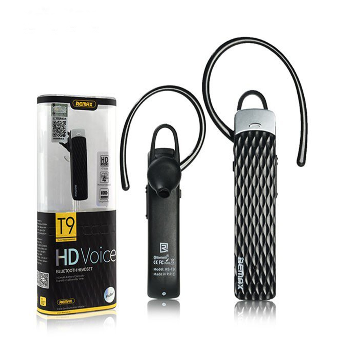 Tai nghe Bluetooth Remax RB-T9 có thiết kế nhỏ gọn và sang trọng, Remax RB-T9 được trang bị công nghệ Bluetooth 4.1 và pin với dung lượng 100mAh. Thời gian đàm thoại, nghe nhạc lên đến 5 - 6 giờ liên tục.Cho âm thanh rõ với công nghệ HD Voice mang lại chất lượng âm thanh tuyệt vời khi đàm thoại và nghe nhạc, cho phép người dùng kết nối cùng lúc với hai thiết bị cùng một lúc, giúp bạn không bỏ lỡ bất kỳ cuộc gọi nào.Tai Nghe Bluetooth Remax RB-T9 được thiết kế độc đáo với các tính năng nổi trội, giúp cho bạn nhiều thuận lợi hơn trong khi nghe nhạc hay nói chuyện điện thoại cùng bạn bè.   Tai nghe Bluetooth Remax RB-T9 ôm sát tai, giảm thiểu tiếng ồn xung quanh, cùng khả năng xoay 180 độ, giúp cho phù hợp với cả 2 bên tai.Đầu tai nghe được trang bị nút đệm cao su, giúp bạn đeo tai nghe trong thời gian lâu mà không gây cảm giác đau tai hay khó chịu. Hỗ trợ Bluetooth V4.0 mới nhất hiện nay, cho đường truyền kết nối nhanh nhất, ổn định nhất, tương thích với nhiều thiết bị có Bluetooh hiện nay, tiết kiệm pin cho thời gian sử dụng lâu hơn.Remax RB-T9 thiết kế nhỏ gọn, ôm sát tai, được Remax giới thiệu ra thị trường để góp phần giúp đưa sản phẩm của hãng đến với nhiều người dùng hơn. Thiết kế như thế sẽ làm cho chiếc tai nghe trở nên nổi bật hơn và tính thẩm mỹ cao hơn. Một cạnh của tai nghe là nơi đặt dải phím tăng giảm âm lượng. Cạnh đối diện là cần gạc công tắc để kích hoạt tai nghe. Vị trí còn lại là đỉnh tai nghe, nơi đặt vị trí của cổng micro USB để sạc cho viên pin 100mAh phía trong. Thông số kỹ thuật - Chất liệu: nhựa. - Kết nối: Bluetooth 4.1. - Dung lượng pin: 100mAh. - Thời gian thoại: 5 - 6 giờ liên tục. - Thời gian chờ: 100 giờ - Kết nối đồng thời 2 thiết bị cùng một lúc.