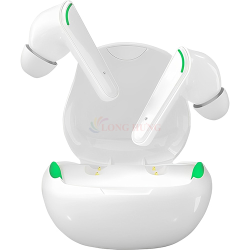 • Thiết kế hai dải đèn LED màu xanh lá ở hai bên cả tai nghe và hộp sạc