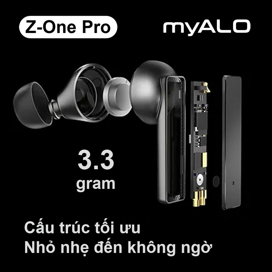 Tai nghe không dây myAlo Z-One Pro là tai nghe Bluetooth 5.3 kiểu dáng in-ear (tai nghe IEM), hộp đựng chế tác từ hợp kim đúc nguyên khối với bản lề mở vô hình, sử dụng nguyên liệu cao cấp theo tiêu chuẩn Châu Âu CE, chống nước IPX4.   Hộp đựng khỏe khoắn và sang trọng chế tác từ hợp kim đúc nguyên khối Lấy cảm hứng từ vẻ đẹp sang trọng và bền bỉ của bật lửa Z.I.P.P.O, đội ngũ của chúng tôi đã thiết kế và sáng tạo ra dòng tai nghe không dây myAlo Z-One Pro với hộp đựng có kiểu dáng khỏe khoắn và sang trọng, chế tác từ hợp kim đúc nguyên khối. Bluetooth 5.3 Bản lề xoay vô hình độc đáo Kiểu dáng mạnh mẽ, sang trọng Thiết kế công thái học, thoải mái khi đeo Âm thanh HiFi stereo đỉnh cao Đàm thoại trong trẻo Điều khiển cảm ứng Sạc 1 lần, nghe liên tục 5 giờ, chờ 40 giờ Chống nước & mồ hôi IPX4     Nhỏ gọn và cá tính Hộp sạc của Z-One Pro được thiết kế nhỏ gọn trong lòng tay với kiểu dáng vuông vức kết hợp với nét cong uyển chuyển mang lại vẻ đẹp tinh tế nhưng đầy cá tính cho chủ sở hữu.       Bản lề xoay vô hình mang đến vẻ ngoài đồng nhất và tinh tế Xuất phát từ ý tưởng về bản lề xoay vô hình, tai nghe myAlo Z-One Pro đã được nhiều lãnh đạo hàng đầu trong lĩnh vực thiết kế cùng nhau phát triển để tạo ra phong cách độc đáo này.     Âm nhạc luôn hiện hữu với công nghệ Bluetooth 5.3 Được tích hợp công nghệ Bluetooth 5.3 cùng bộ xử lý âm thanh thế hệ mới Jerry AD6973D4, tai nghe không dây Z-One Pro có khả năng kết nối nhanh và ổn định hơn. Công nghệ Bluetooth 5.3 tiêu thụ điện năng thấp giúp tăng thời gian sử dụng cho tai nghe Z-One Pro. Bạn có thể hoàn toàn yên tâm thưởng thức âm nhạc suốt cả ngày hoặc xem những bộ phim dài tập mà không lo hết pin.       Loa Dynamic 10mm Được trang bị bộ loa sử dụng trình điều khiển động Dynamic 10mm cùng bộ nút tai silicon nhiều kích cỡ đi kèm, tai nghe không dây Z-One Pro đưa âm thanh vào sâu trong lỗ tai; tái tạo ra nhiều chi tiết âm nhạc hơn, âm trầm mạnh mẽ, âm trung mượt mà và âm cao trong trẻo. Mang đến cho bạn những trải nghiệm âm thanh stereo Hi-Fi đỉnh cao như đang ngồi trong rạp hát.     Công nghệ truyền tải âm thanh AAC codec Được trang bị công nghệ truyền tải âm thanh độ nét cao AAC codec, tai nghe không dây Z-One Pro tái tạo ra âm thanh gần như không có độ trễ với chất lượng tuyệt vời gần như nguyên bản.       Nghe nhạc, xem phim và đàm thoại suốt cả ngày Với dung lượng pin mỗi bên tai nghe 30mAh, khi hết pin bạn chỉ cần 1 giờ để sạc đầy và sau đó có thể nghe nhạc hoặc đàm thoại liên tục đến 5 giờ. Ở chế độ chờ, thời gian sử dụng của mỗi bên tai nghe có thể đạt tới 40 giờ. Hộp đựng tích hợp pin sạc dung lượng lớn 300mAh, giúp dễ dàng sạc lại cho tai nghe thêm 5 lần, nâng tổng thời gian nghe liên tục lên đến 30 giờ và thời gian chờ đến 240 giờ. Bạn dễ dàng sạc điện cho hộp đựng thông qua cổng sạc Type C. Vì vậy, bạn cứ thoải mái tận hưởng âm nhạc, xem phim, chơi game hay đàm thoại mà không lo hết pin cho những chuyến đi ngắn ngày.     Điều khiển cảm ứng thông minh Tai nghe myALO Z-One Pro được trang bị hệ thống điều khiển cảm ứng thông minh, chỉ cần chạm lên tai nghe bạn có thể điều khiển tiếp nhận, từ chối hoặc kết thúc cuộc gọi; tăng giảm âm lượng; bật tắt hoặc chuyển bài hát; hoặc kích hoạt trợ lý giọng nói một cách dễ dàng.     Mặt điều khiển thiết kế kiểu gương sang trọng Mặt điều khiển của tai nghe Z-One Pro được làm bằng vật liệu kính hữu cơ bóng như gương, đẹp và sang trọng.     Thiết kế công thái học mang đến cảm giác nhẹ nhàng & thoải mái khi đeo Sau hàng nghìn thử nghiệm mô phỏng công thái học, sự thoải mái trong từng góc xoay của tai nghe Z-One Pro được các nhà thiết kế của chúng tôi đặc biệt quan tâm trau chuốt từng chút một. Tai nghe được làm bằng nhựa ABS+PC cao cấp siêu nhẹ chỉ có 3,3 gram kết hợp với 4 bộ nút tai silicon mềm mại đủ kích cỡ (XS,S,L,M), mang đến cảm giác nhẹ nhàng và dễ chịu đến khó tin dù đeo nó trong một thời gian dài.       Chống nước & mồ hôi IPX4 Tai nghe không dây Z-One Pro có khả năng chống nước & mồ hôi theo tiêu chuẩn IPX4, giúp bạn có thể sử dụng thoải mái trong các hoạt động bình thường như tập luyện thể thao, chạy bộ, hoặc gặp mưa phùn bất chợt, hoặc lau chùi bằng khăn ẩm mà không gây hư hại gì. Lưu ý: