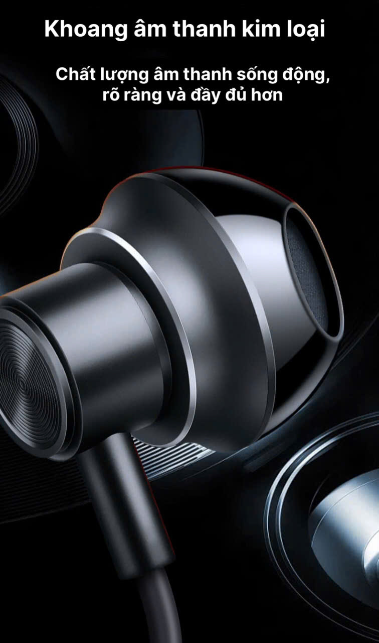 Loa: 12 mm. Chân cắm âm thanh: 3,5mm. Trọng lượng: 12g. Cáp tai nghe: Cáp đàn hồi cao TPE có dây tráng men Micrô: bộ điều khiển có micro. Điều khiển dây: được hỗ trợ