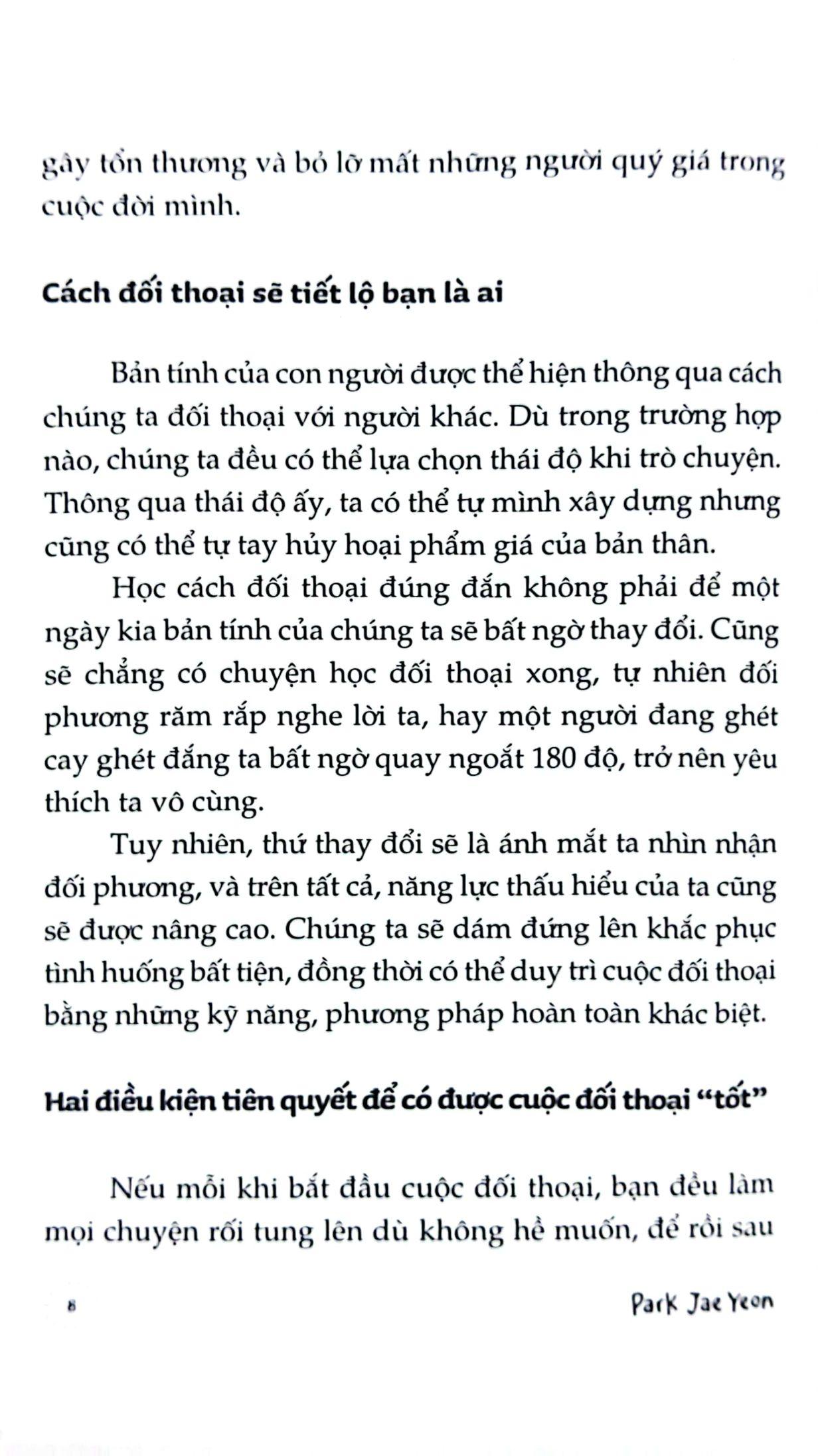 Học cách đối thoại đúng đắn không phải để một ngày kia bản tính chúng ta sẽ bất ngờ thay đổi hay đối phương đột nhiên răm rắp nghe lời ta. Mà quan trọng hơn, ta sẽ rèn luyện được con mắt nhìn nhận người khác, và trên tất cả, đạt tới năng lực thấu hiểu. Chúng ta sẽ dám đứng lên khắc phục tình huống khó khăn, tiếp tục đối thoại bằng những kỹ năng hoàn toàn khác biệt.