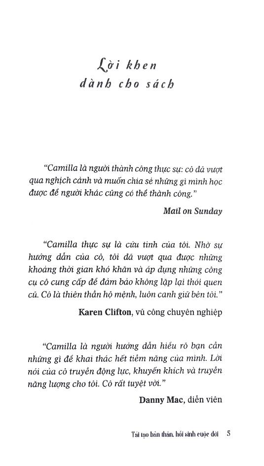 Cuốn sách sẽ giới thiệu phương pháp tái tạo bản thân gồm 8 bước cùng rất nhiều bài tập nhỏ, kết hợp cùng trải nghiệm của chính tác giả và những người đã áp dụng thành công phương pháp này, giúp bạn nhận diện và hiểu được những gì mình cần, hướng dẫn bạn cách vượt qua trở ngại và kiên định hướng đến mục tiêu. Với lối viết gần gũi, dễ hiểu, không giáo điều áp đặt, cuốn sách sẽ nhẹ nhàng nhắc nhở bạn kiên trì thực hiện từng bước để đạt đến điều bạn hằng mong mỏi.