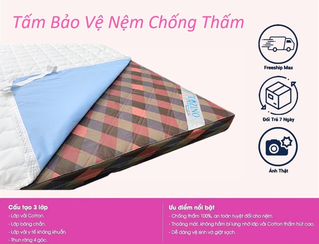 Tấm lót bảo vệ nệm chống thấm 100% giúp bạn giải quyết triệt để vấn đề nước đổ lên nệm, hay bé tè dầm, nôn ói làm nệm bị dơ và có mùi khó chịu.