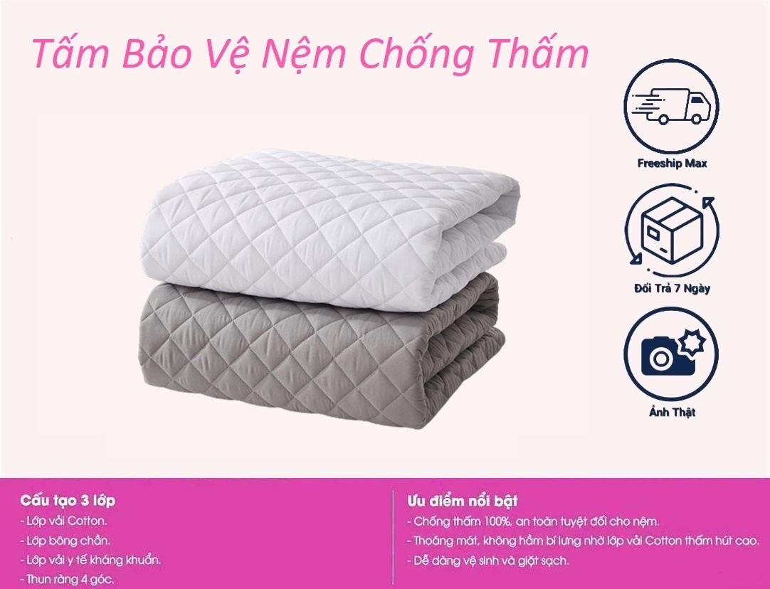 Mua tại TiktokTấm lót bảo vệ nệm chống thấm 100% giúp bạn giải quyết triệt để vấn đề nước đổ lên nệm, hay bé tè dầm, nôn ói làm nệm bị dơ và có mùi khó chịu. Rất thích hợp khi bạn vừa mua một tấm nệm mới, hoặc muốn bảo quản để nệm sử dụng được lâu dài. Cấu tạo sản phẩm