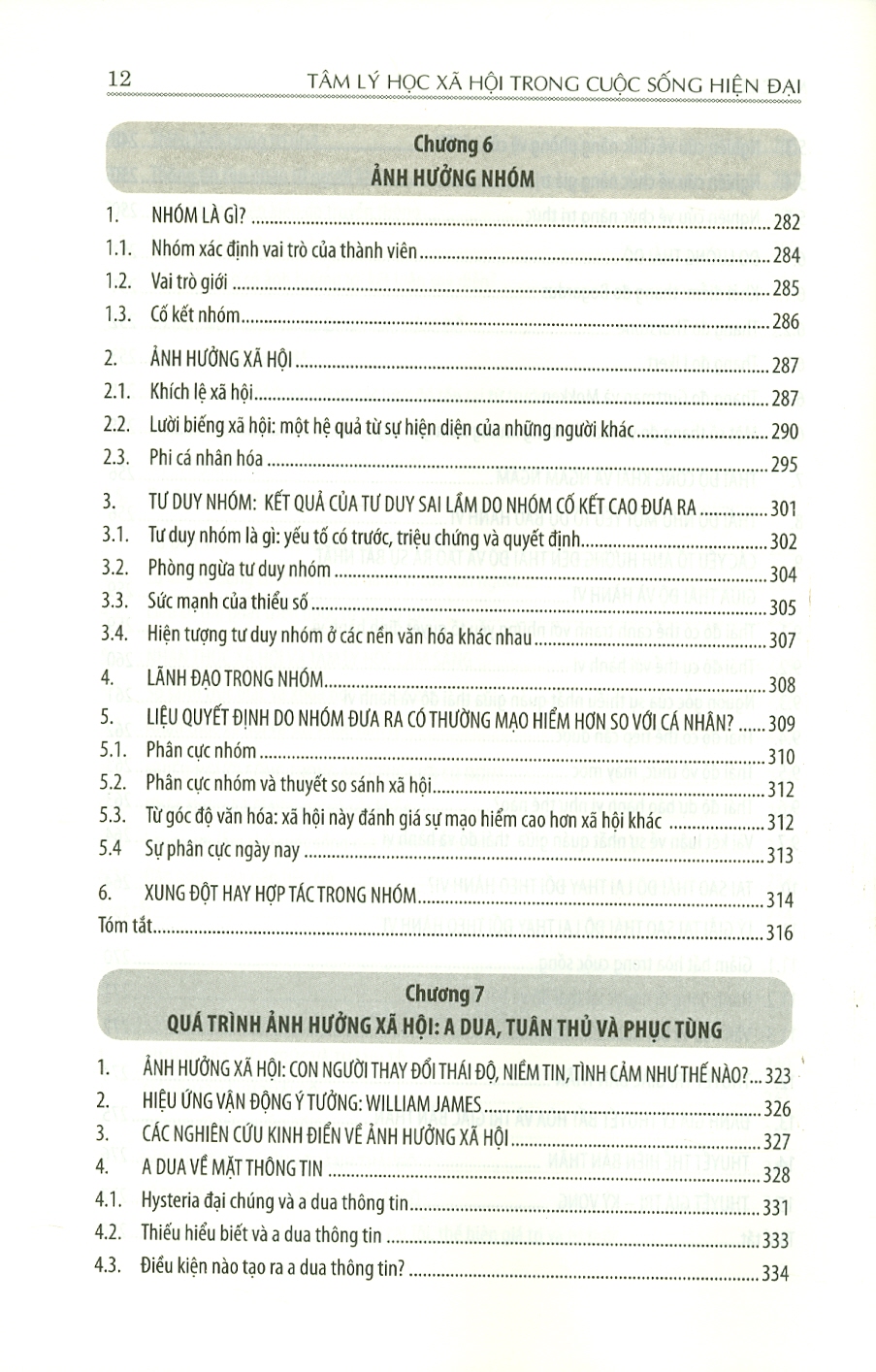 Chương 1: chuyên ngành tâm lý học xã hội Chương 2: Cái tôi nhìn từ góc độ văn hóa và xã hội Chương 3: Sự hấp dẫn và các mối quan hệ: từ gắn bó đầu đợi đến tình yêu lưá đôi Chương 4: Nhận thức xã hội: Chúng ta nghĩ về cuộc sống xã hội như thế nào Chương 5: Thái độ và hành vi Chương 6: Ảnh hưởng nhóm Chương 7: Quá trình ảnh hưởng xã hội: A dua, tuân thủ và phục tùng Chương 8: Thuyêt phục Chương 9: Hành vi liên nhóm thù địch: Định kiến, định khuôn và thù địch Chương 10: Xâm kích: sợ chỉ xuyên suốt nhân loại Chương 11: Vị tha và hành vi ủng hộ xã hội