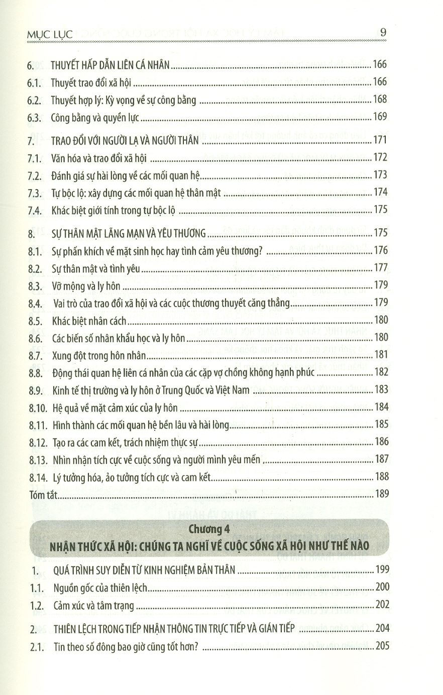 Cuốn sách gồm 11 chương: Chương 1: chuyên ngành tâm lý học xã hội Chương 2: Cái tôi nhìn từ góc độ văn hóa và xã hội Chương 3: Sự hấp dẫn và các mối