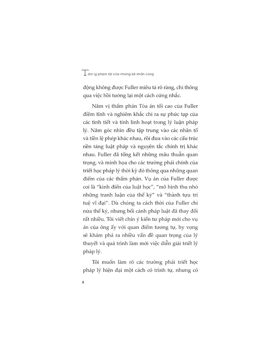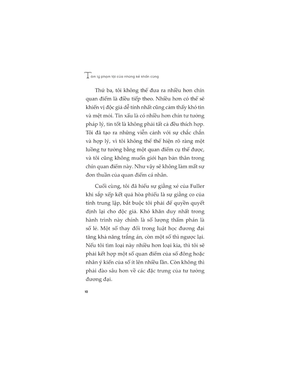 Tâm Lý Phạm Tội Của Những Kẻ Khốn Cùng Tội ác từ đâu mà có? Ranh giới thiện – ác mong manh tới mức nào? Trong cuốn sách “Tâm lý phạm tội của những kẻ khốn cùng” sẽ mang đến câu trả lời vô cùng chân thực từ một ví dụ giả định kinh điển của thế kỷ. Được lấy cảm hứng từ cuốn The case of the Speluncean Explorers (tạm dịch: Vụ án những nhà thám hiểm Speluncean) của tác giả Lon Fuller, được xuất bản lần đầu trên tạp chí Havard Law Review năm 1949. Cuốn sách kể về một vụ án pháp lý hư cấu được coi là vĩ đại nhất mọi thời đại, với những tư tưởng pháp luật hiển hình. Bản thảo gốc được in đầy đủ trong cuốn sách này, nói về năm nhà thám hiểm bị kẹt trong hang động, phải ăn thịt một người bạn đồng hành để có thể sống sót. Sau khi được giải cứu, họ bị truy tố tội danh giết người - một tội danh chắc chắn phải nhận án tử hình. Bản thảo của Fuller đã tạo ra năm vị thẩm phán Tòa án tối cao để đưa ra những tình huống pháp lý khó phân xử trong vụ án.  Và trong cuốn sách này, tác giả Peter Suber đã tiếp tục thêm vào chín quan điểm mới hợp thời đại hơn để làm sáng tỏ được nguồn gốc tội ác của những nhà thám hiểm. Thông qua những lập luận được coi là “cuộc chiến pháp lý kinh điển của thế kỷ”, cuốn sách sẽ là câu trả lời thực sự thuyết phục cho câu hỏi “Tội ác sinh ra từ đâu?”.  Hấp dẫn, hợp thời và logic là những điều dễ nhận thấy trong cuốn sách tâm lý tội phạm đặc biệt này. Đặc biệt với những góc nhìn pháp lý thuyết phục. Đặc biệt với kết cấu rõ ràng trong từng câu chữ, mang ý nghĩa tranh biện sắc bén và hợp lý. Đặc biệt với sự liên kết tới một vụ án cụ thể và hấp dẫn, được coi là một phương pháp giảng dạy dễ hiểu của nhiều nhánh trong luật học. Với phong cách tươi vui và giản dị của mình, Peter Suber đã khiến cuốn sách trở thành một công cụ vô giá cho ai mới tìm hiểu về những tư tưởng pháp lý đương đại cũng như nghiên cứu về tâm lý của một nhóm tội phạm đặc biệt – những kẻ ở trong hoàn cảnh tột cùng của nỗi thống khổ.