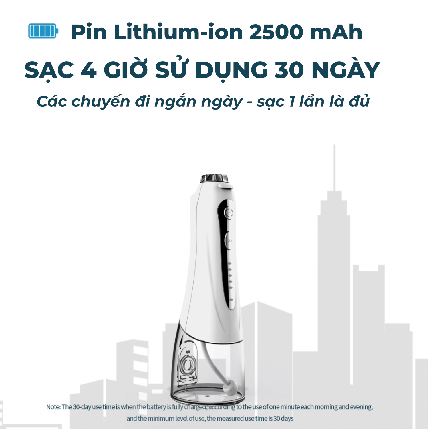 THÔNG SỐ SẢN PHẨM Pin: 2500 mAh pin Lithium-ion, có thể sạc lại (sử dụng được 30 ngày, 2 phút/ lần/ ngày để tốt cho răng nướu, thời gian sử dụng sẽ phụ thuộc
